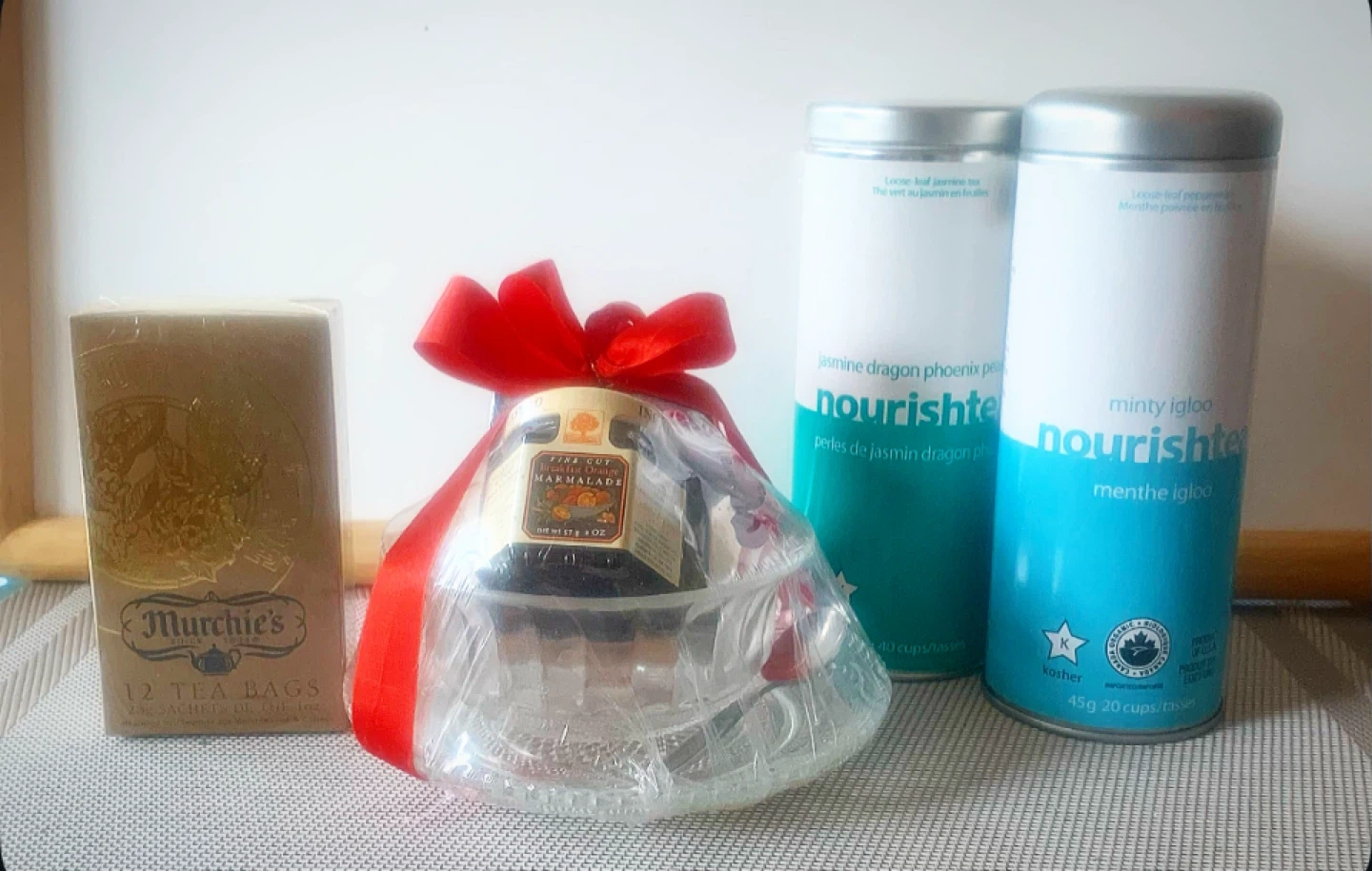 Here's a lovely tea set including Murchie's tea bags, Nourishtea Jasmine Dragon Phoenix Pearls, and Nourishtea Minty Igloo tea! It also comes with a jar of Fine Cut Breaking Orange Marmalade and Crabtree & Evelyn tea.