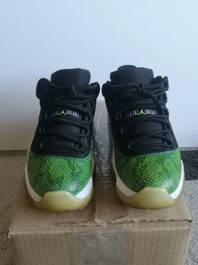 These Jordan 11 Retro Low sneakers feature a striking green snakeskin design. They are US size 10 in great condition. Perfect for adding a unique touch to your sneaker collection.