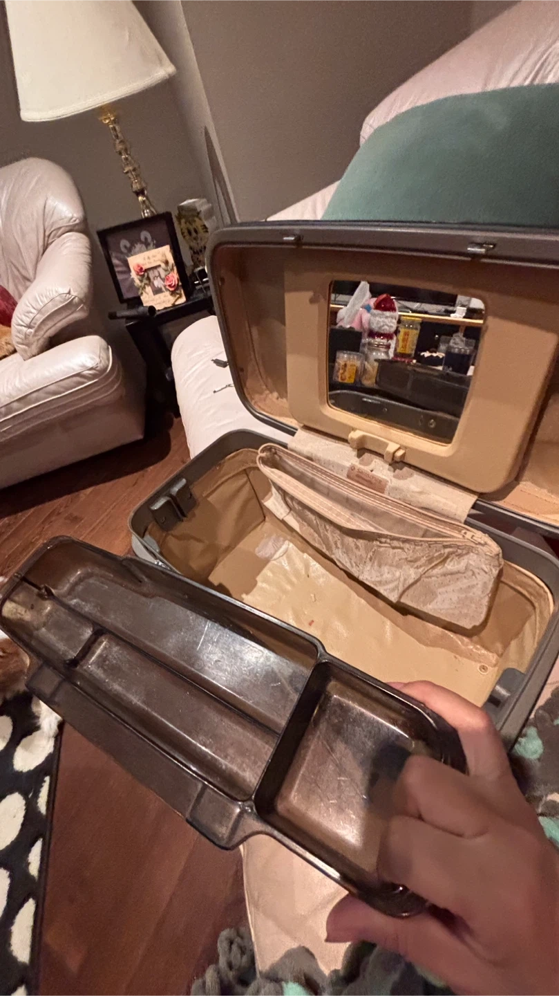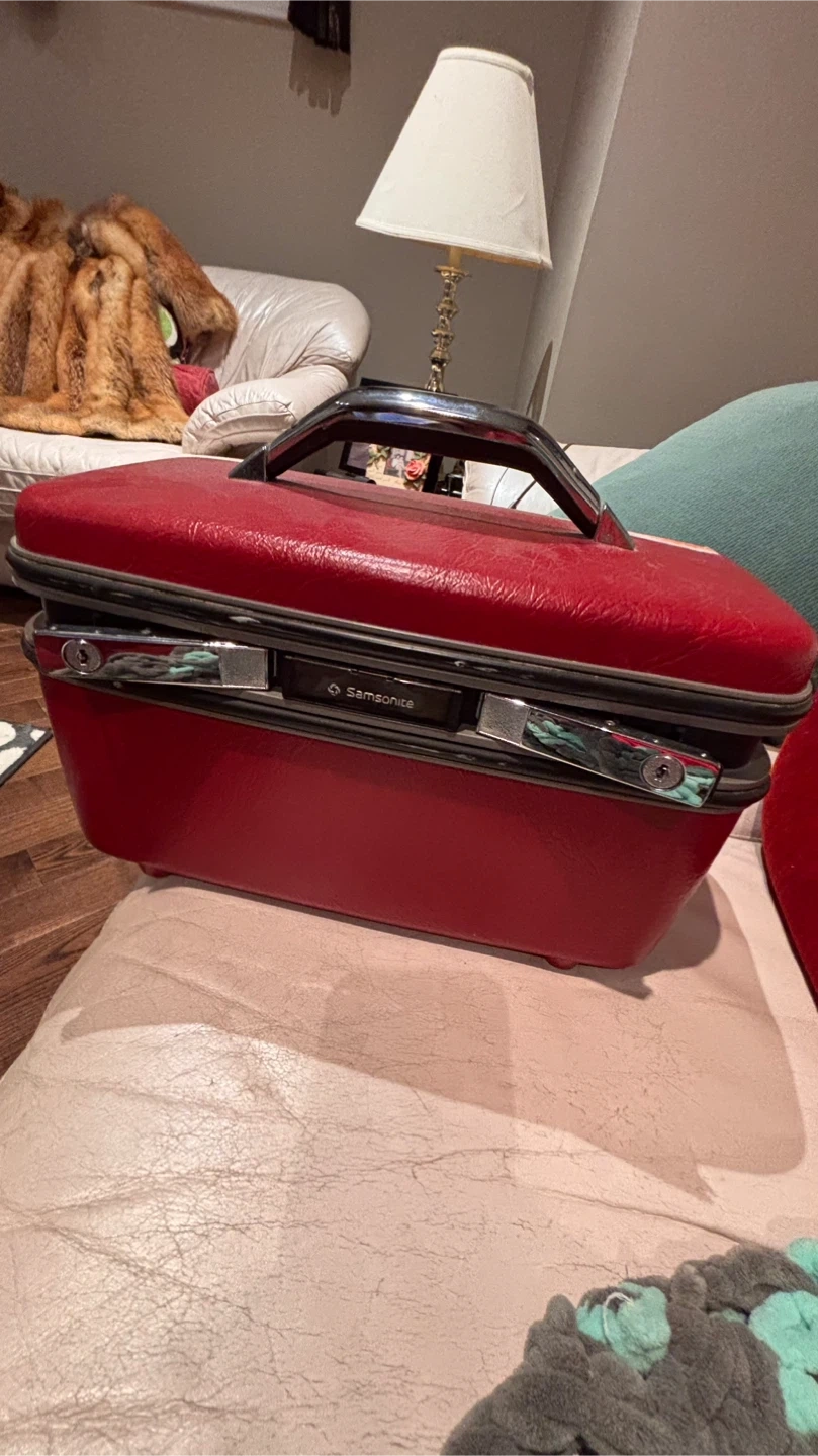 Selling a vintage Samsonite vanity case in red. It has a mirror inside and compartments for organizing your cosmetics and toiletries. Perfect for travel or storage!