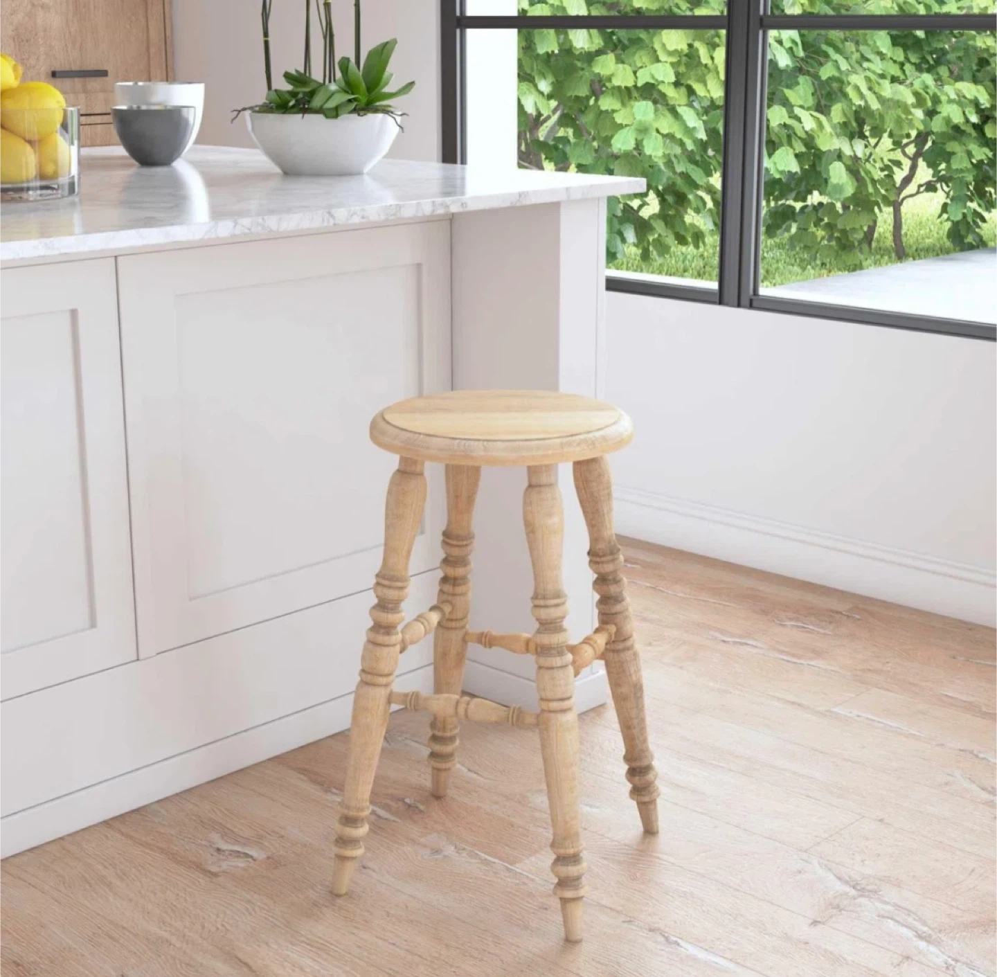 Bring farmhouse style to your home with this Sacramento backless solid wood counter stools! This natural stool is handcrafted with lightweight Mindi wood for easy moving and lasting durability. Turned legs and footrests give this otherwise ordinary piece new life. The natural finish brings an organic touch to your space. The backless style makes this piece versatile.