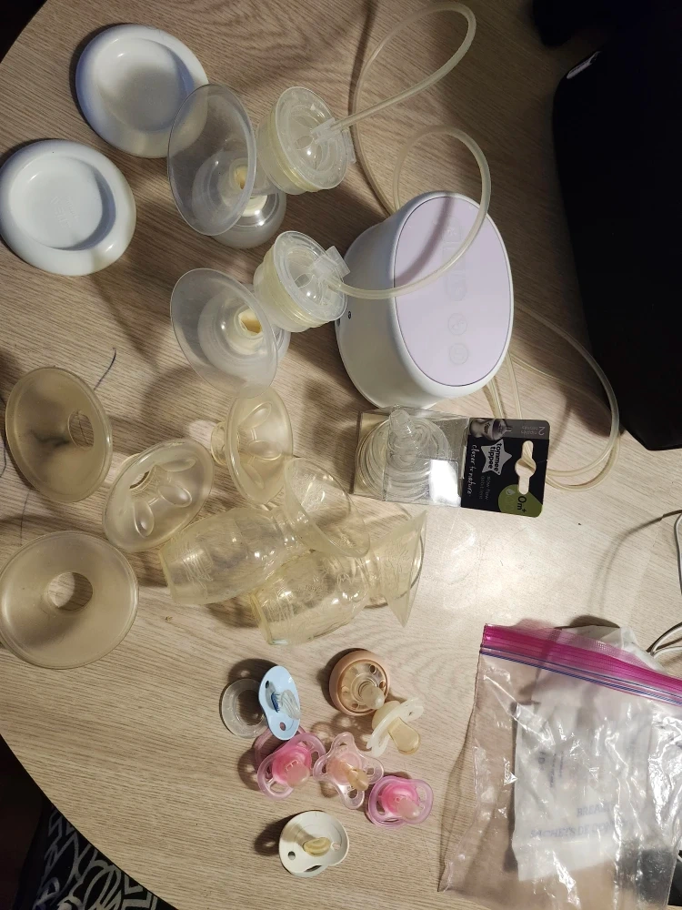 Selling an Avent breast pump along with a collection of pacifiers and unused Tommee Tippee bottle teats. It includes various components and accessories, perfect for new parents. The pacifiers are in different colours and styles. Includes carrying bag. All items are clean and ready for a new home!