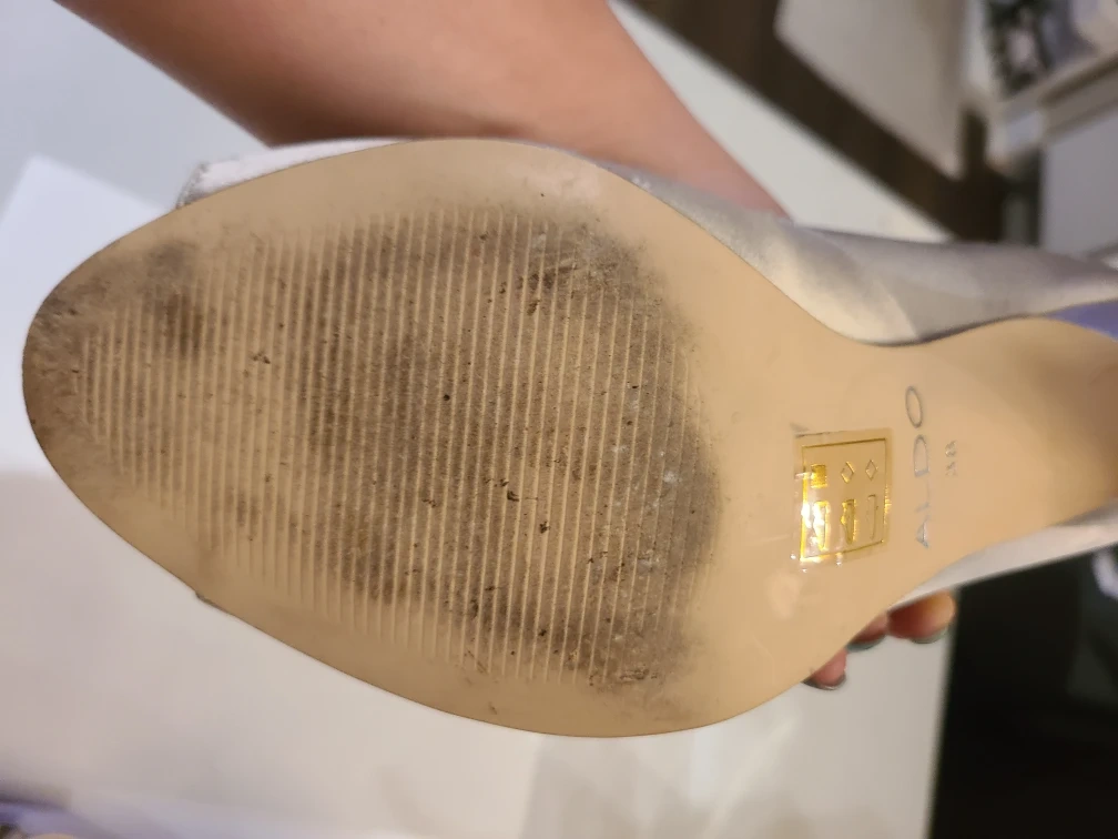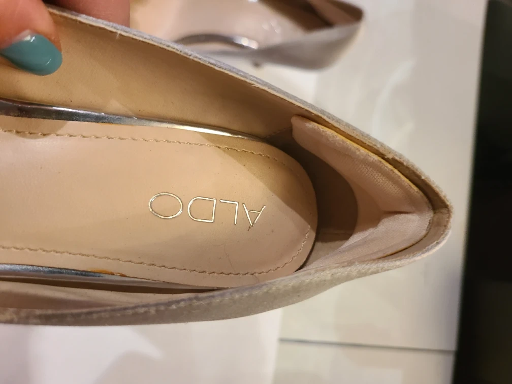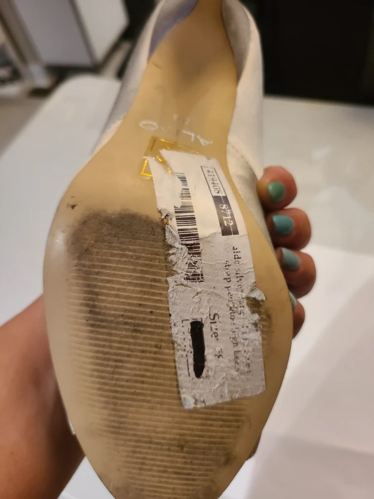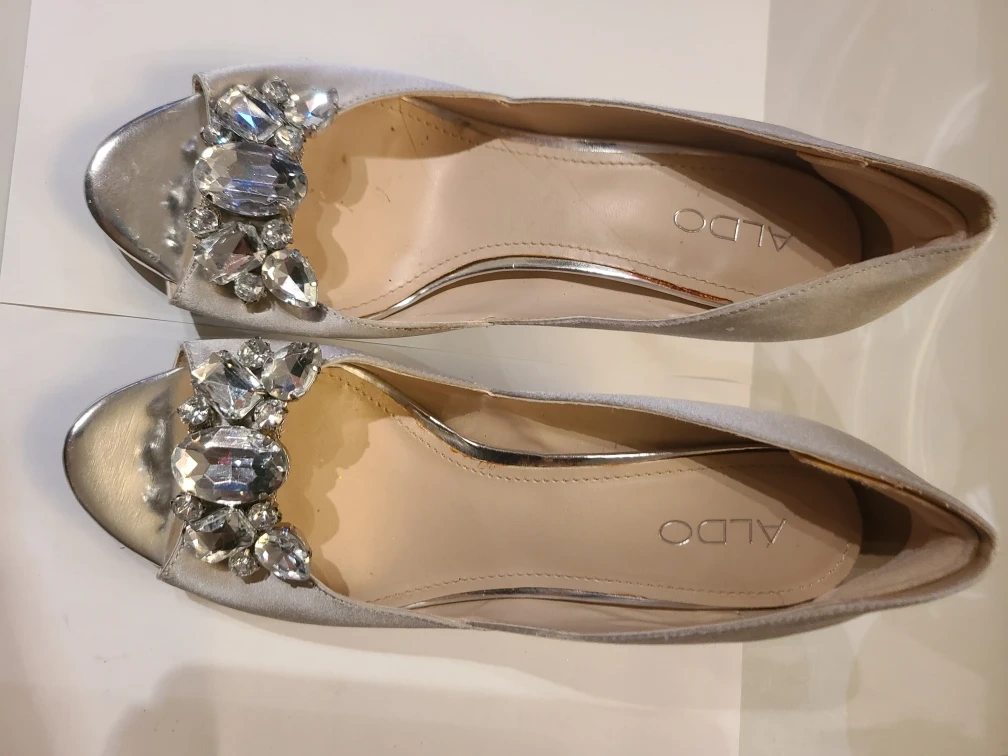 Selling a pair of ALDO silver heels, size 38. They have some beautiful embellishments on the front, perfect for the holidays. There are some signs of wear on the soles and heel, as shown in the photos. Heel grip included. 3" heel.