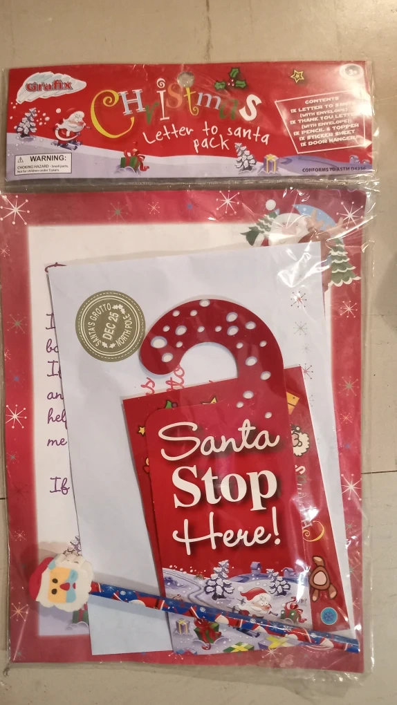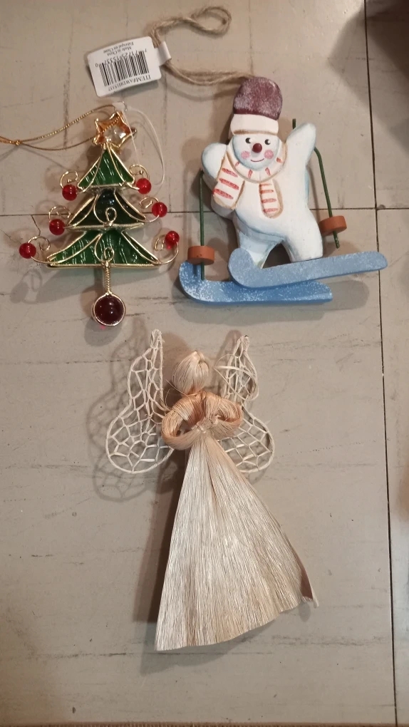 Selling a collection of charming Christmas ornaments, including a beaded Christmas tree, a straw angel, and a snowman on skis. Also included is a 'Christmas Letter to Santa' pack to add some extra holiday cheer to your home!