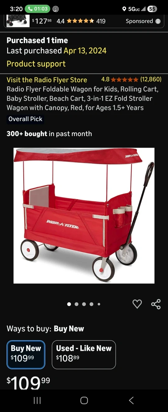 I'm selling a Radio Flyer Foldable Wagon for kids! It's a rolling cart, baby stroller, and beach cart all in one. It's designed as a 3-in-1 EZ fold stroller wagon with a canopy. Perfect for ages 1.5+ years!