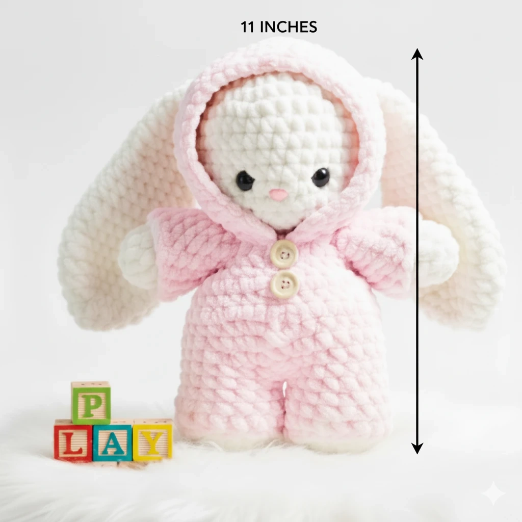 This adorable handmade crocheted bunny plush is looking for a new home! It's approximately 11 inches tall and features a cute pink hooded outfit. Perfect for a child's room or as a cuddly friend!