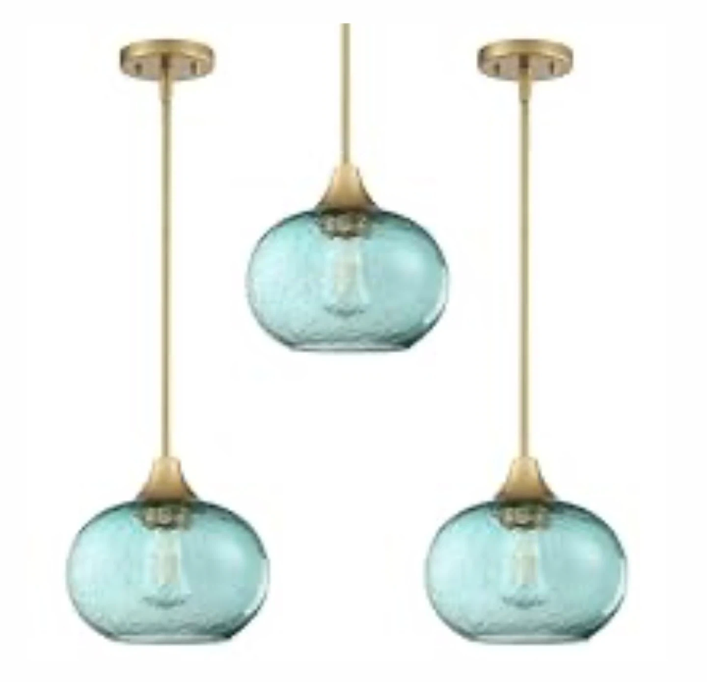 Set of 3, 1 Light Hanging Indoor Kitchen Island Pendant Ceiling Light Fixtures 7.7" Aqua/Teal, Blue Glass with Gold Rod, Modern Farmhouse Dinning