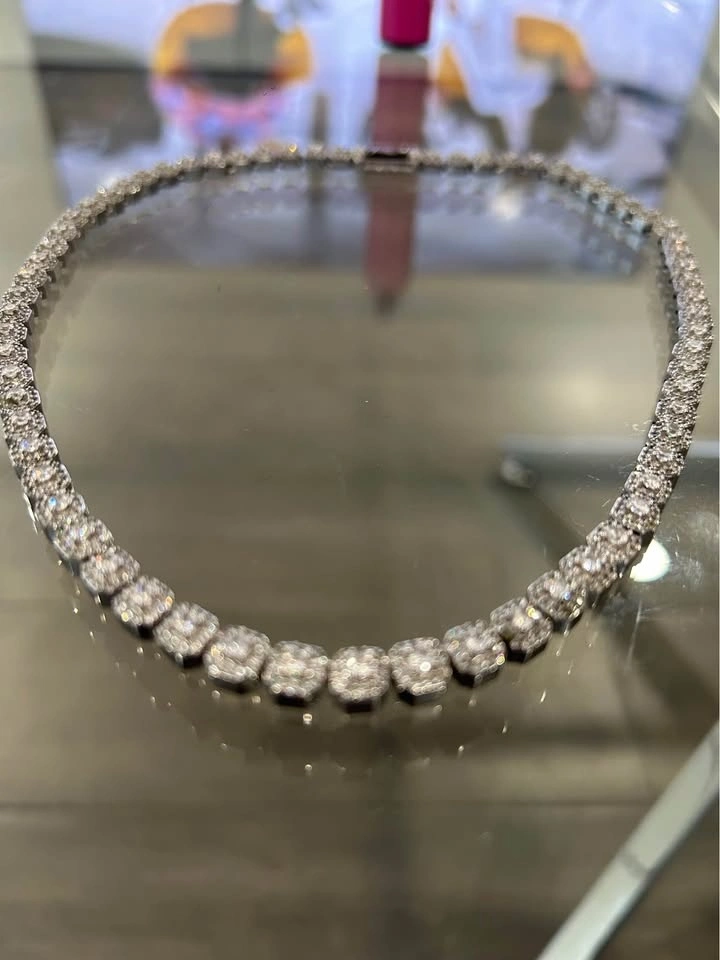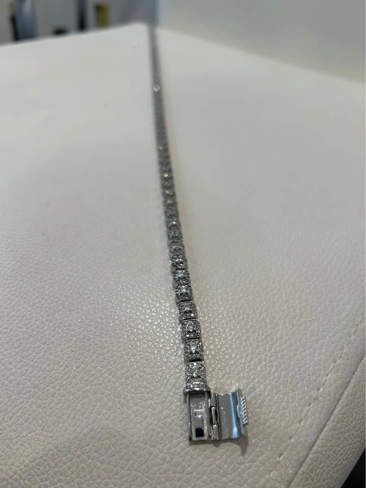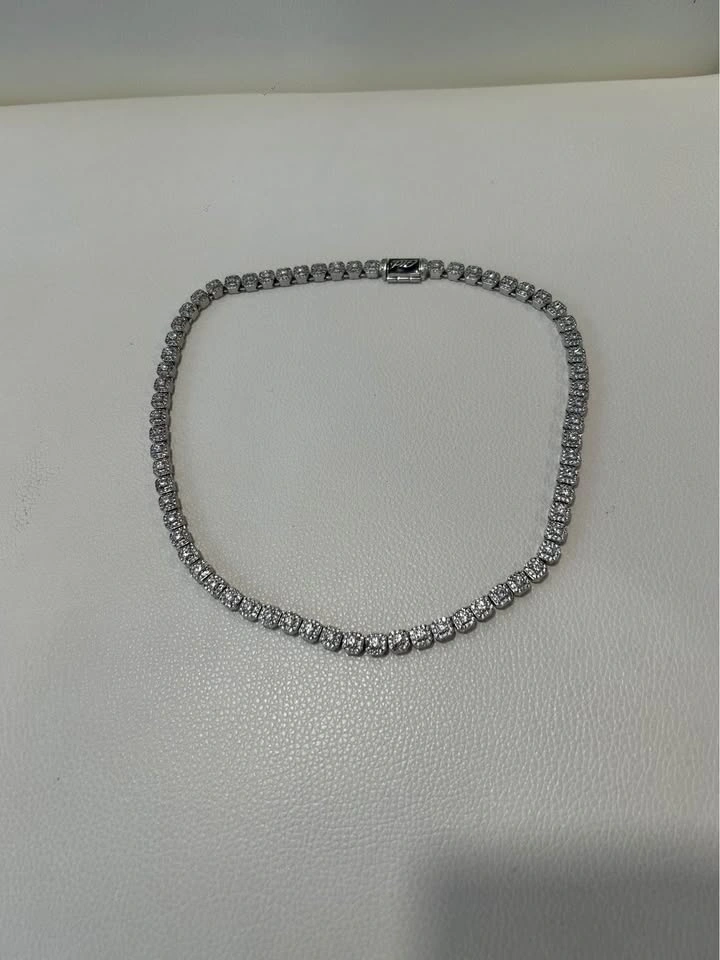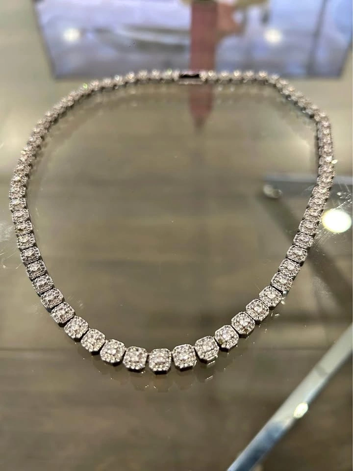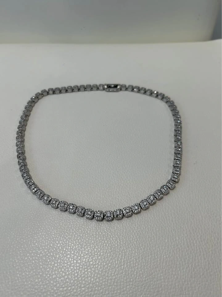 Introducing the Clustered Tennis Chain, Set in 14k White Gold, this piece features clustered hand-set stones and is complete with signature clasp ( GLD).