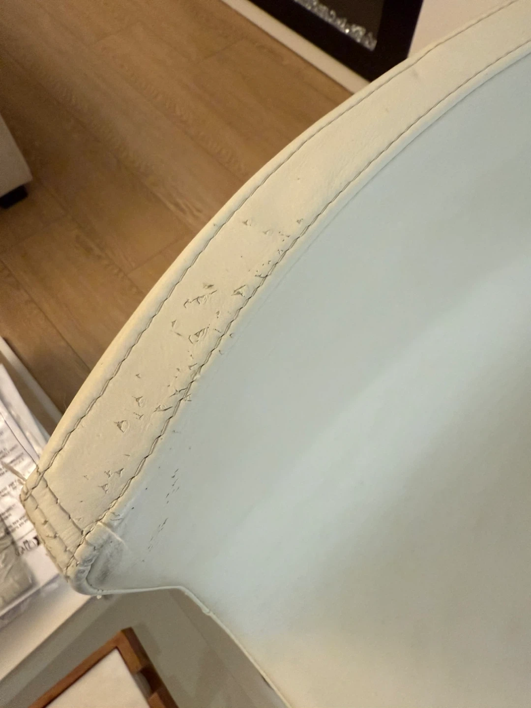 Selling a set of 4 bar stools. They have a white seat and a chrome frame. There are some signs of wear and tear on the seats, as shown in the pictures.