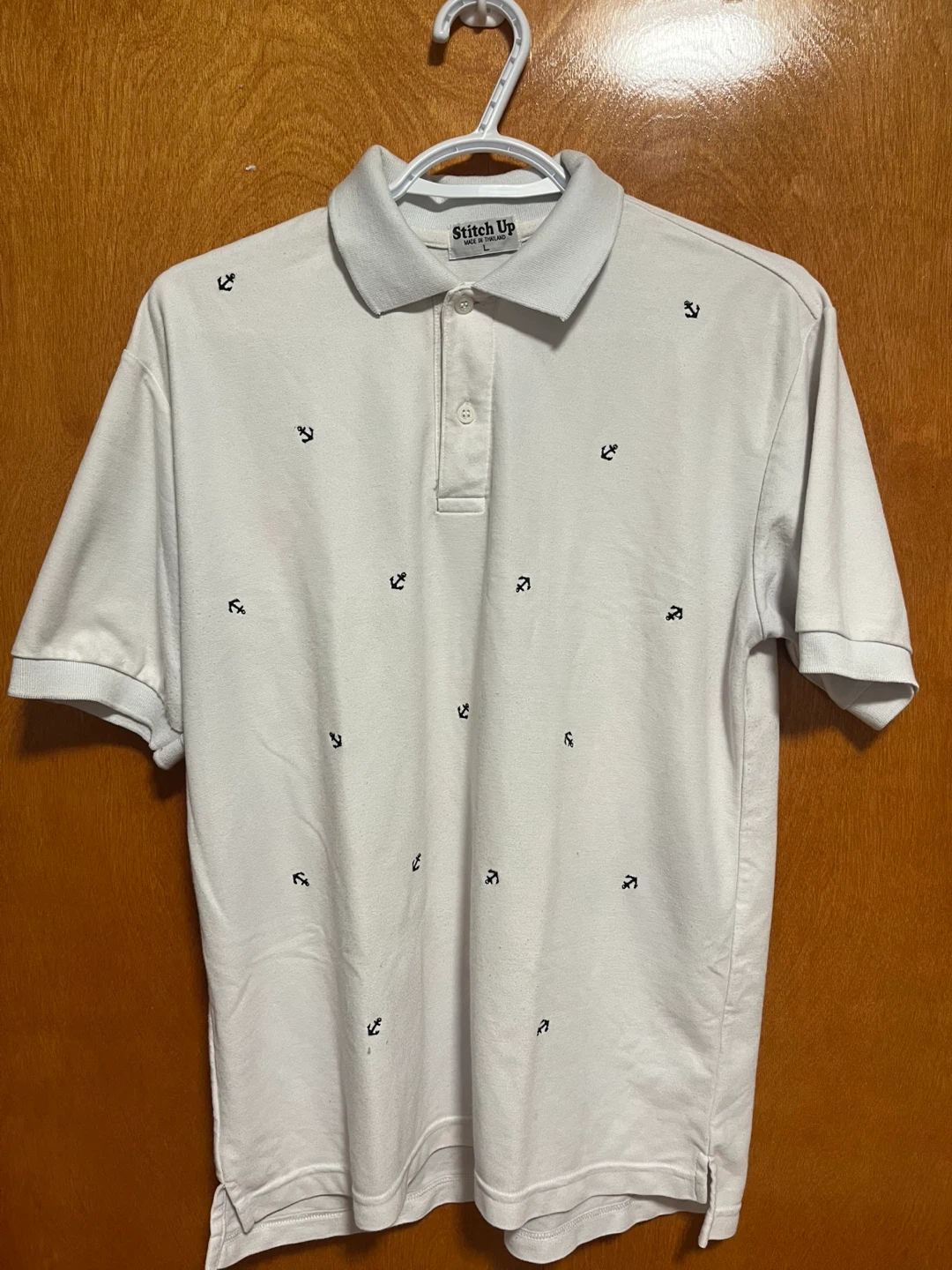 Selling a Stitch Up polo shirt in white, size large. It features a pattern of small anchors. This shirt is made in Thailand and is in great condition!