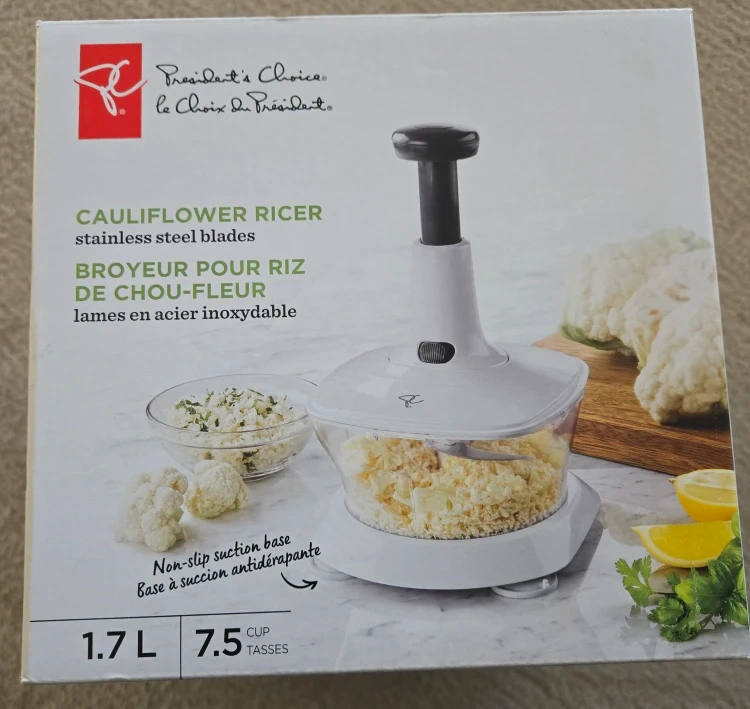 I'm selling a brand new President's Choice cauliflower ricer! It comes in its original box with care and instruction booklet. It features stainless steel blades and a non-slip suction base. The capacity is 1.7L or 7.5 cups. Get ready to make delicious cauliflower rice with ease!