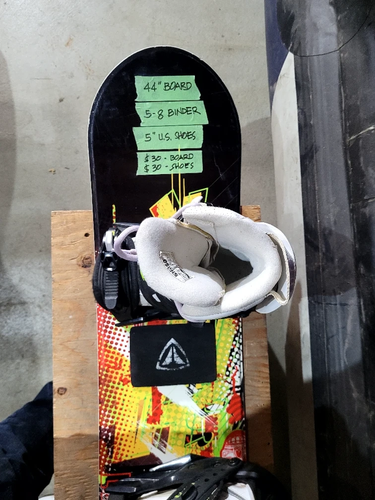 Selling a snowboard, bindings, and shoes set. The board is 44 inches, the bindings are size 5-8, and the shoes are size 5 US. Great for hitting the slopes!