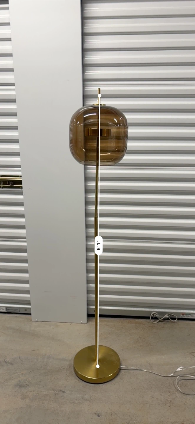 Here's a stylish floor lamp with a brown glass globe shade and a sleek gold stand! It would be a great addition to any room and provide a warm, ambient light