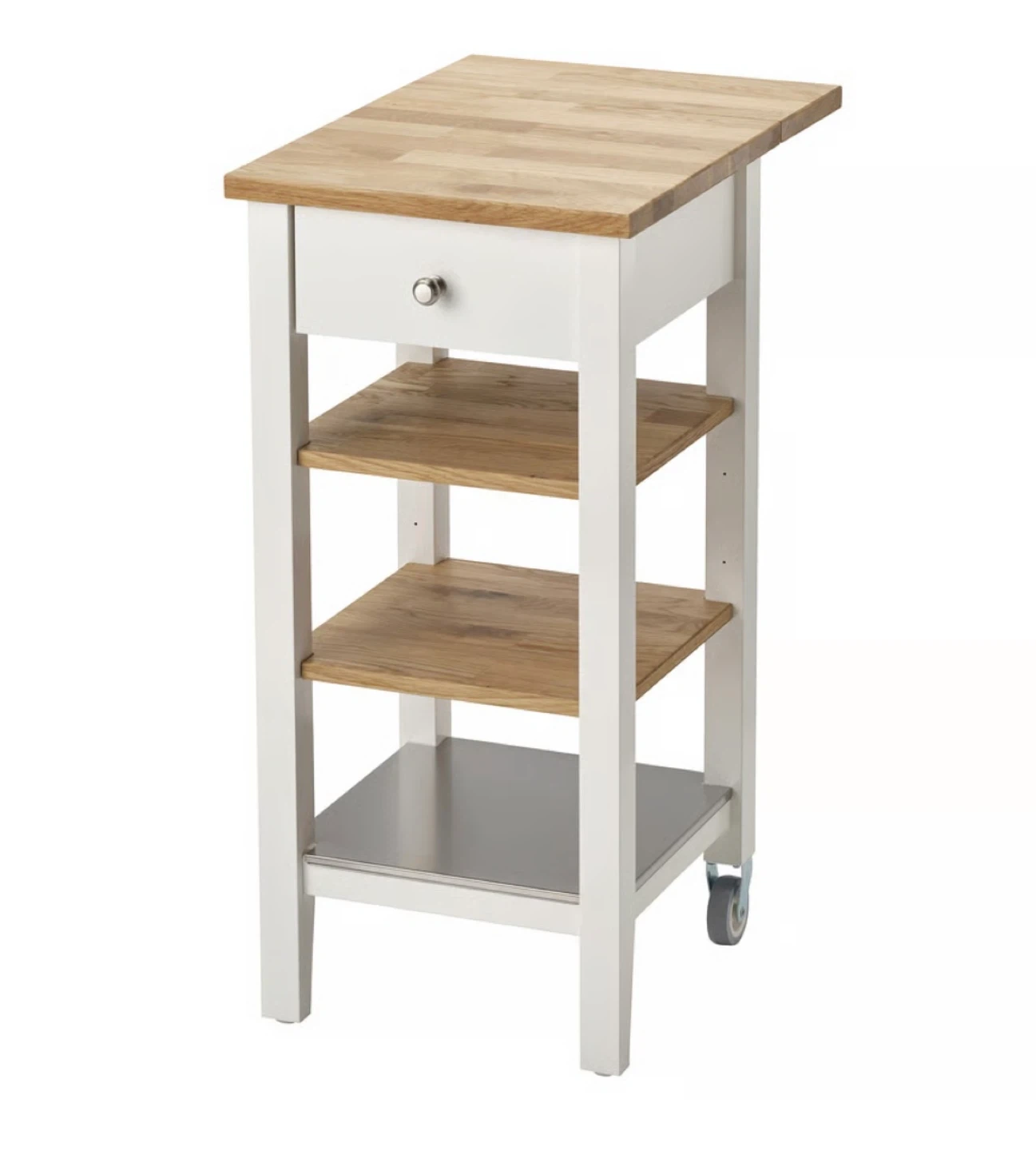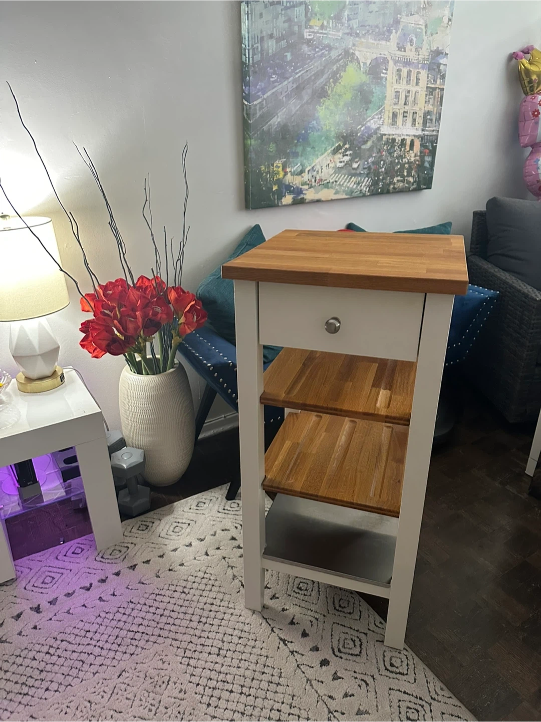 Selling an IKEA Stenstorp kitchen cart in great condition! It features a white frame with a wooden top, a drawer, and shelves for storage. Perfect for adding extra counter space and organization to your kitchen.