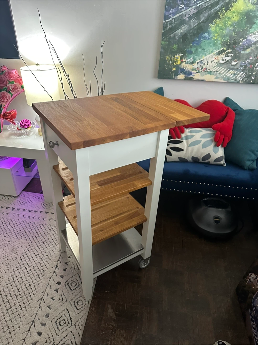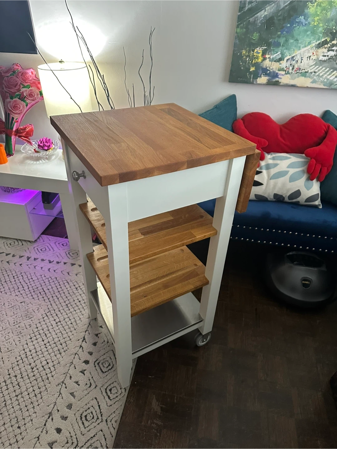 Selling an IKEA Stenstorp kitchen cart in great condition! It features a white frame with a wooden top, a drawer, and shelves for storage. Perfect for adding extra counter space and organization to your kitchen.