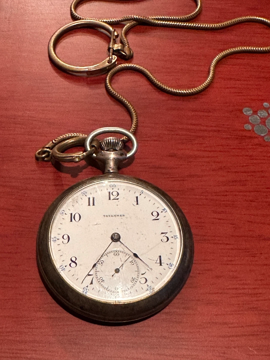 Selling a Tavannes antique pocket watch. It comes with a chain. The watch shows signs of wear consistent with its age, adding to its vintage charm. It keeps accurate time with daily winding. Great antique watch