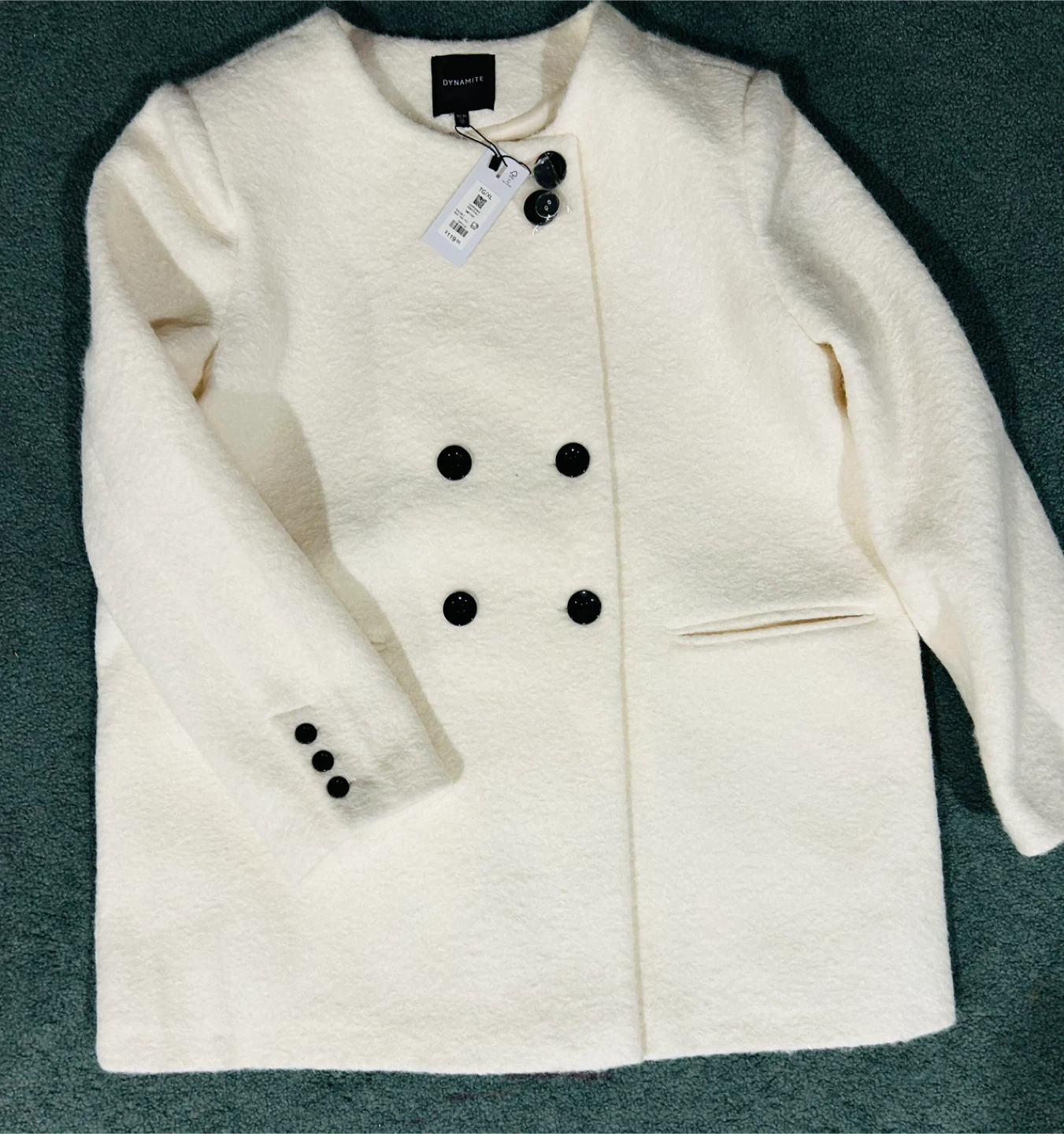 Selling a brand new Dynamite coat in a beautiful sea salt white colour! It's a size TG/XL and still has the tags attached. Originally bought for $119.95, this coat is a stylish addition to any wardrobe
