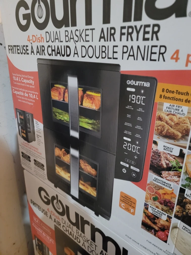 Selling a brand new Gourmia 4-Dish Dual Basket Air Fryer! It has a space-saving vertical design and a 10.4 L capacity. It also features 8 one-touch cooking functions for easy use