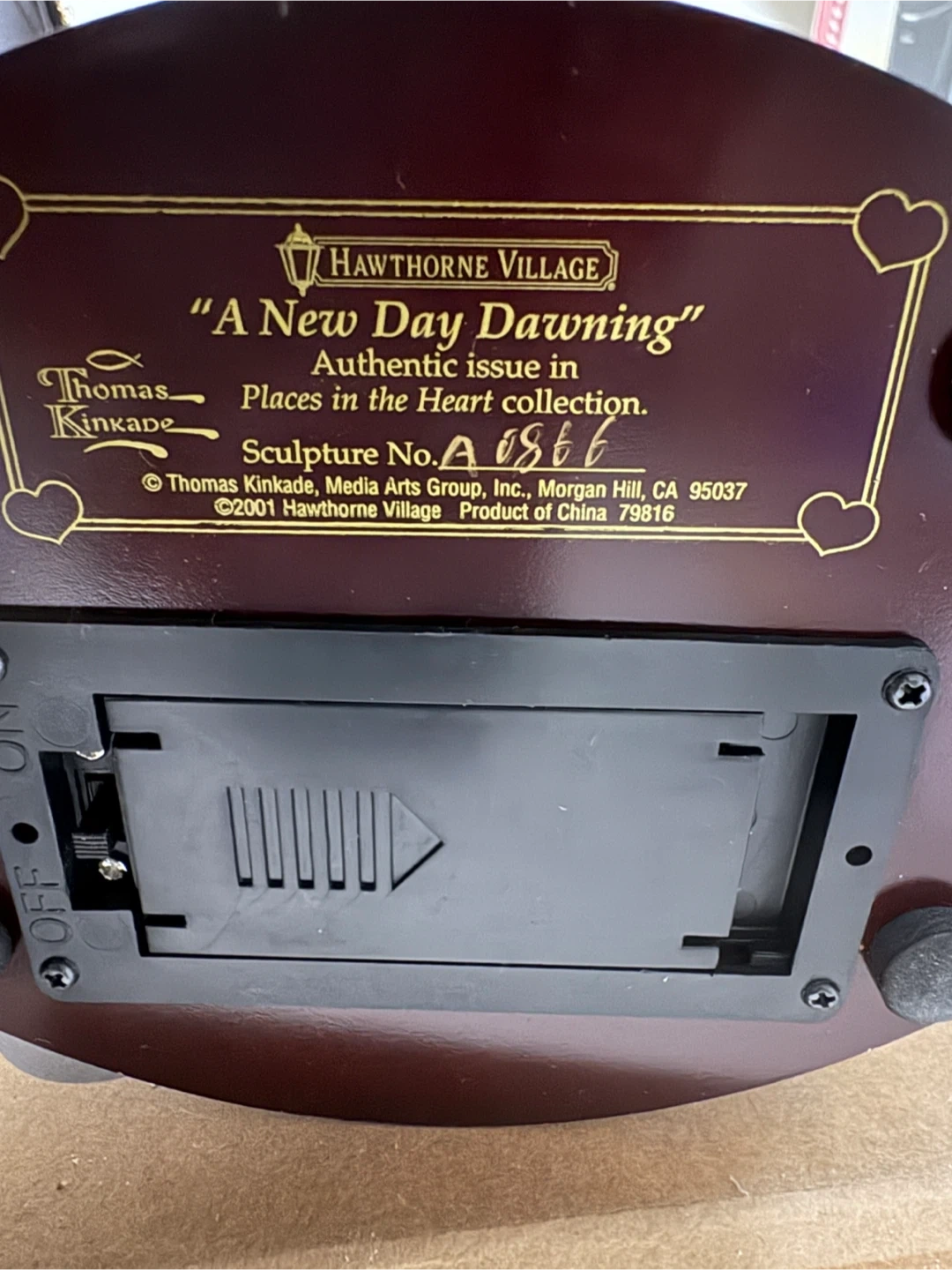 Selling a Thomas Kinkade Hawthorne Village sculpture titled "A New Day Dawning" from the Places in the Heart collection. It's a charming piece with intricate details and a lovely design. Perfect for collectors or anyone who appreciates Thomas Kinkade's artwork