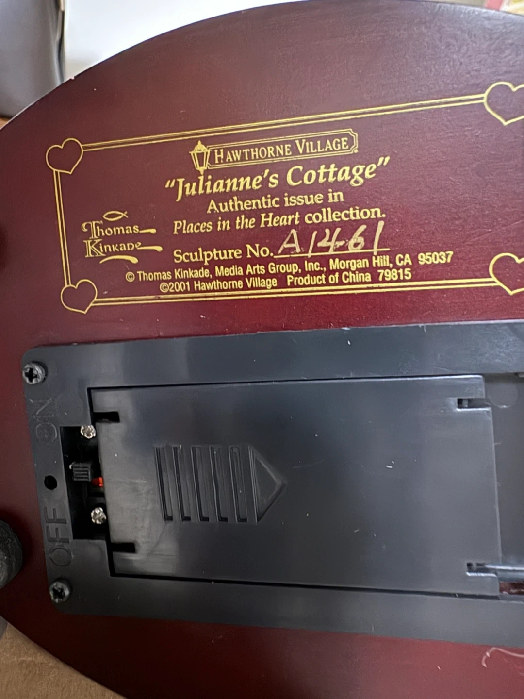 Selling a Thomas Kinkade Julianne's Cottage from the Hawthorne Village collection. It's an authentic issue in the Places in the Heart collection and is sculpture number A/461. This charming piece is from 2001 and would make a lovely addition to any collection
