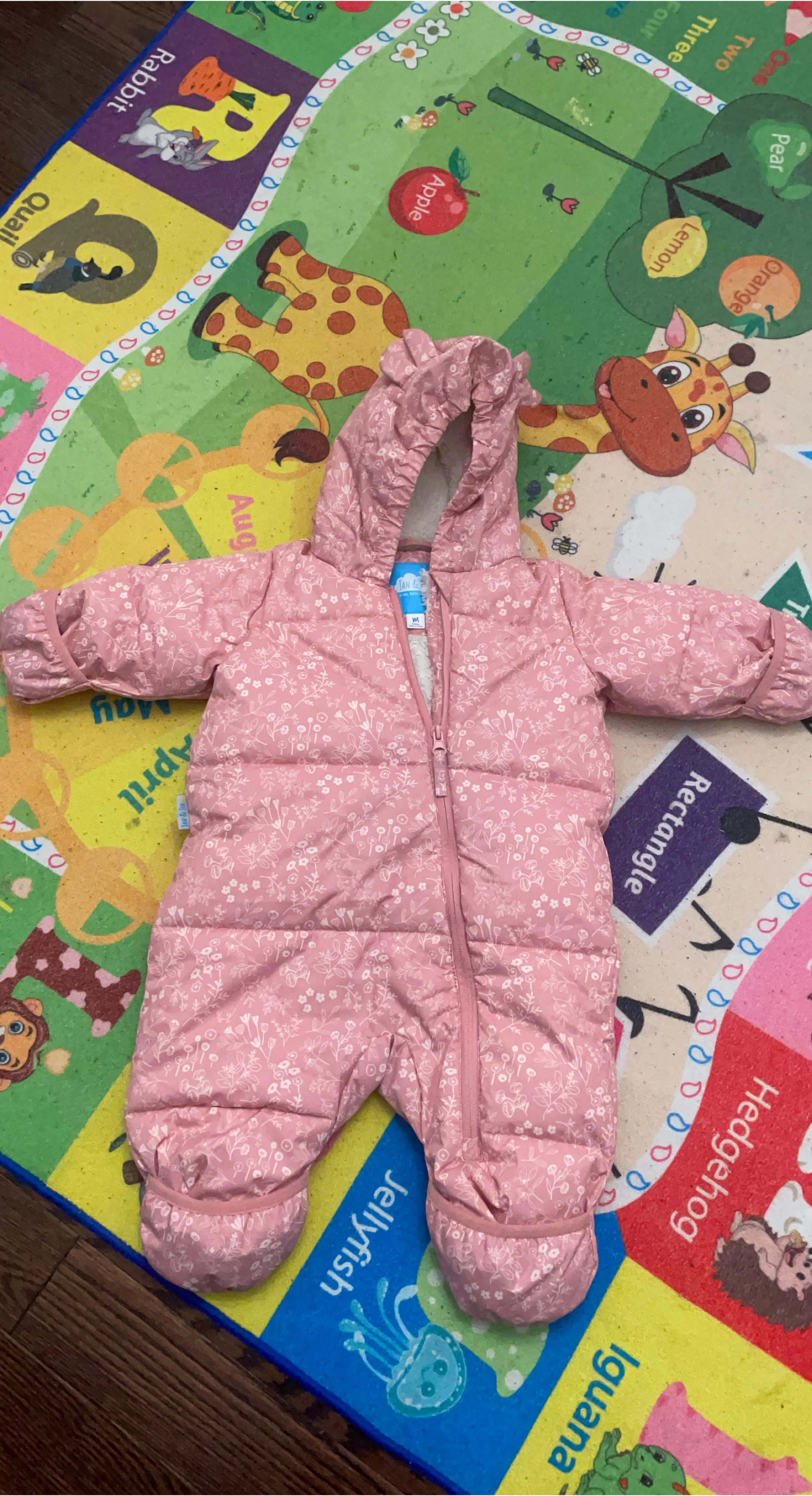 Here's a cute pink floral snowsuit from Jan & Jul! It's in great condition and perfect for keeping your little one warm during the colder months. The size is M.
