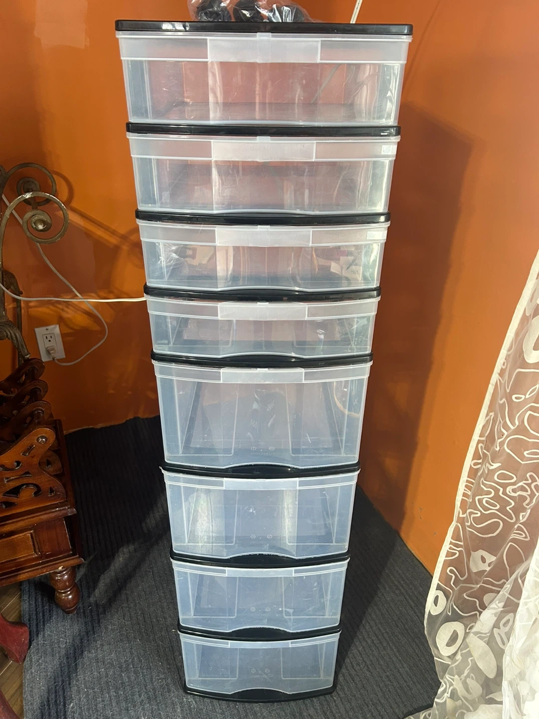 Keep your space tidy with this 8-drawer plastic storage tower, complete with smooth-rolling wheels for easy mobility. This storage solution is used but remains highly functional for organizing various items. The unit is in good condition, ready to bring order to any room.