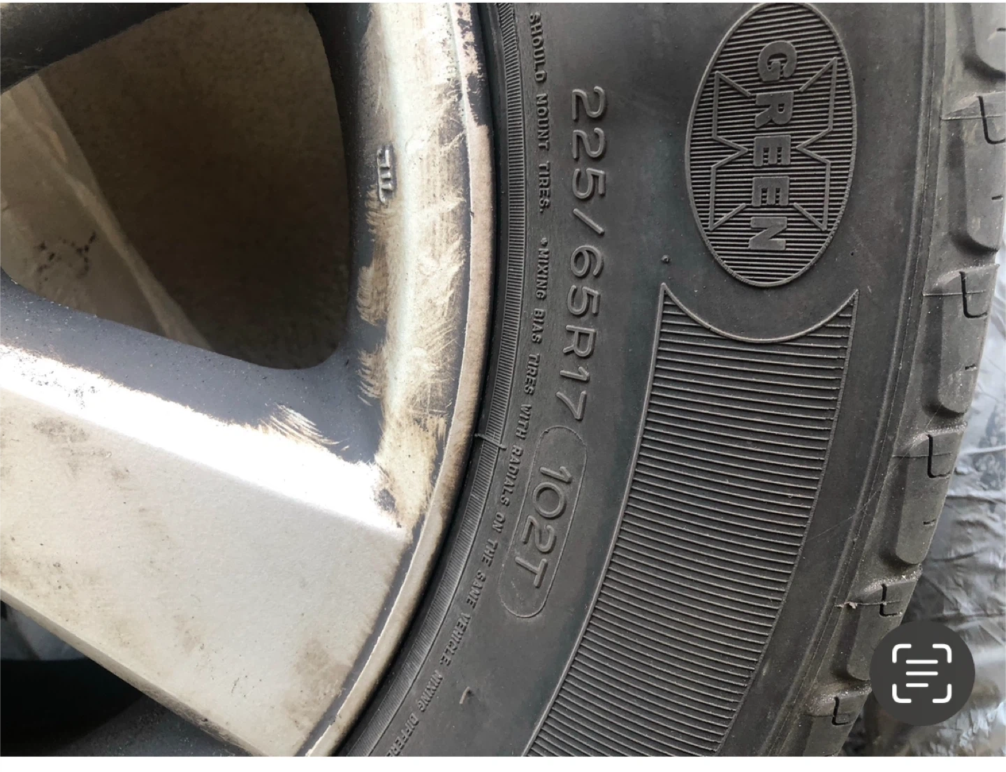 225/65R17 102T. The tire is a Michelin brand tire.