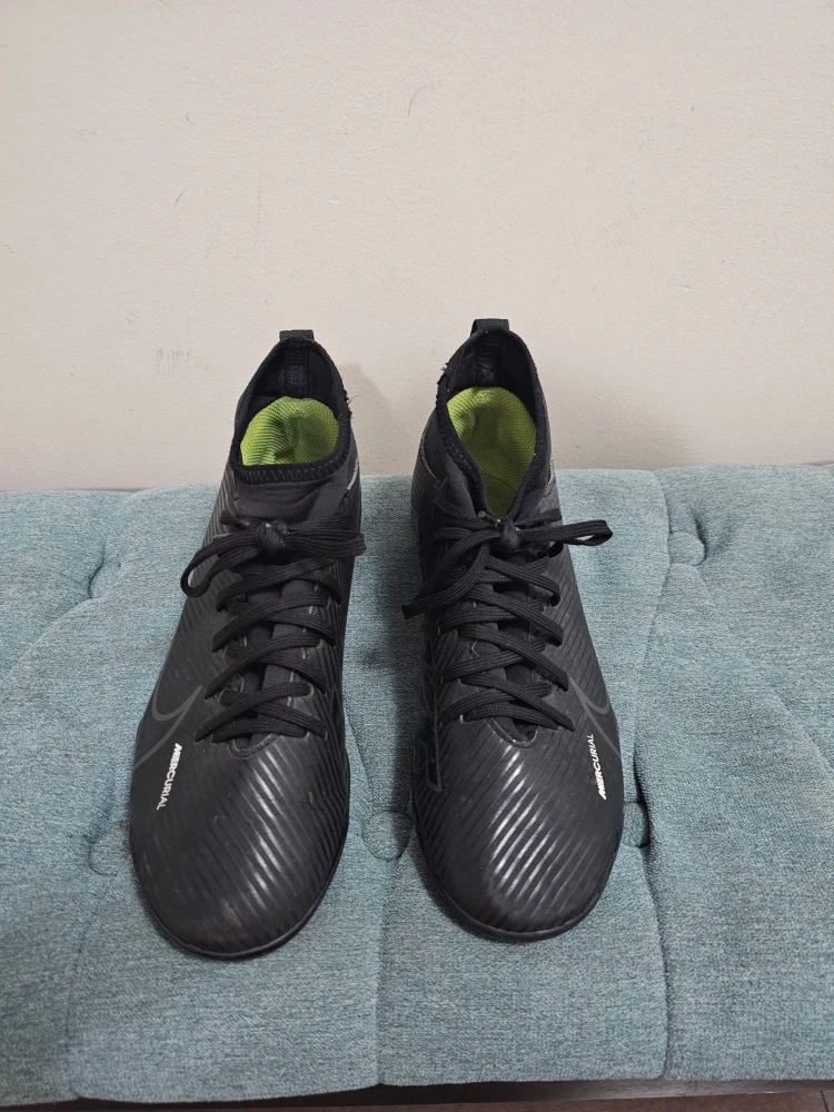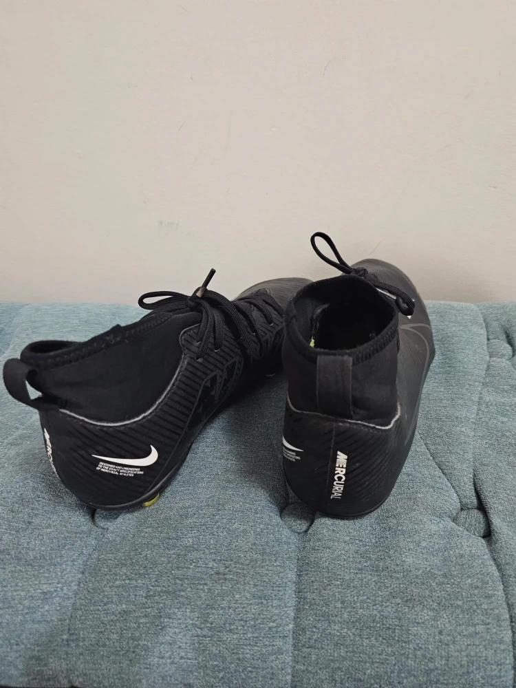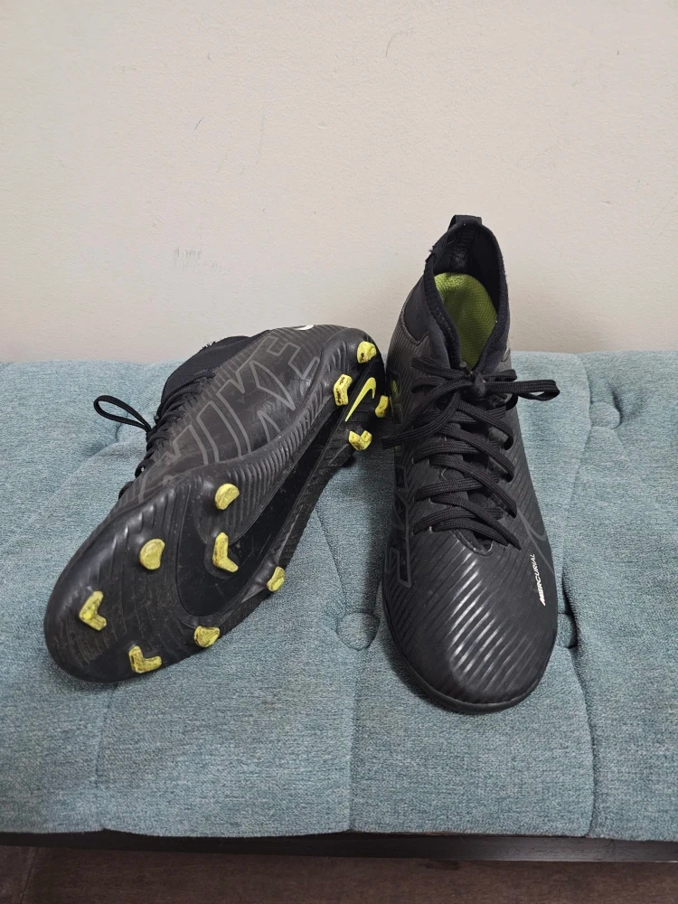 Selling a pair of Nike Mercurial football shoes. They're black with yellow accents and in good condition. Perfect for hitting the field! size 6y