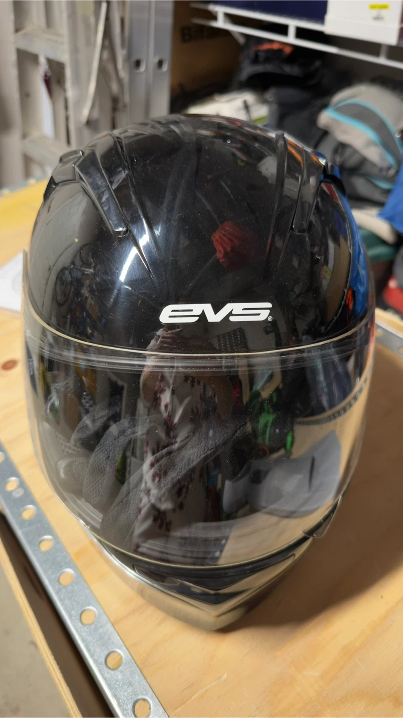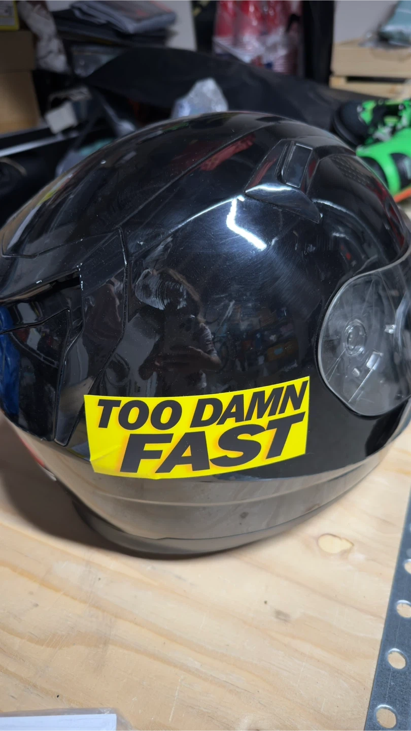 Selling a black EVS Motorcycle helmet. Has a sticker that says "Too Damn Fast" on the side which can be removed + CTS sticker.