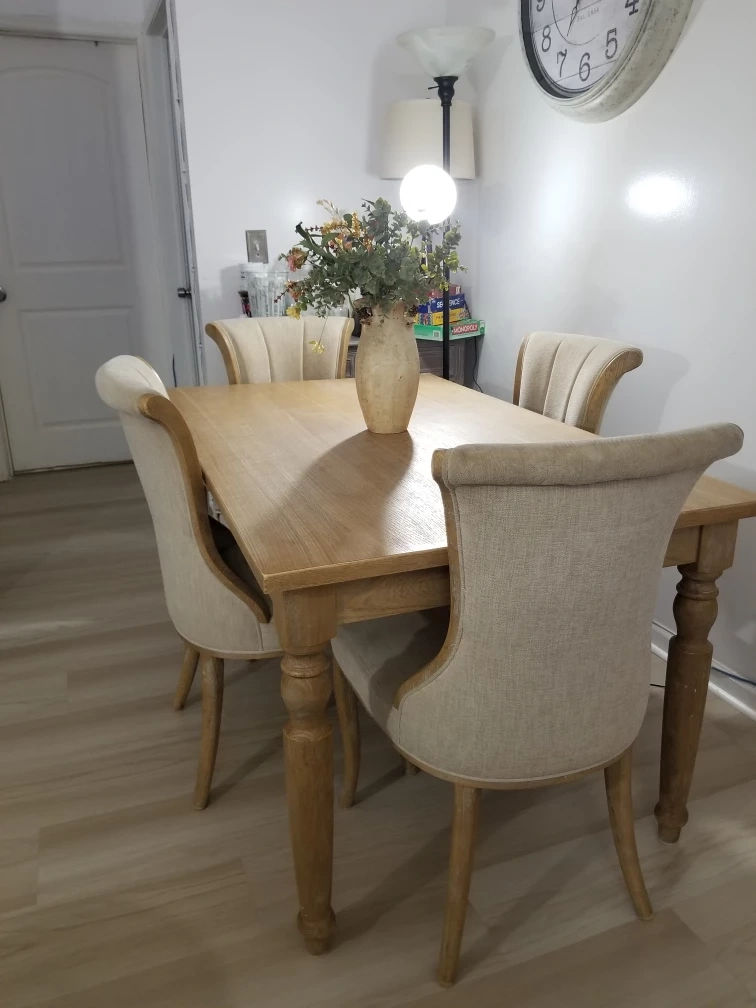 Selling a dining table with four chairs. The set is a light wood color and would look great in any dining space. It's in good condition and ready for a new home! Perfect for family dinners or gatherings with friends (price up for negotiation)