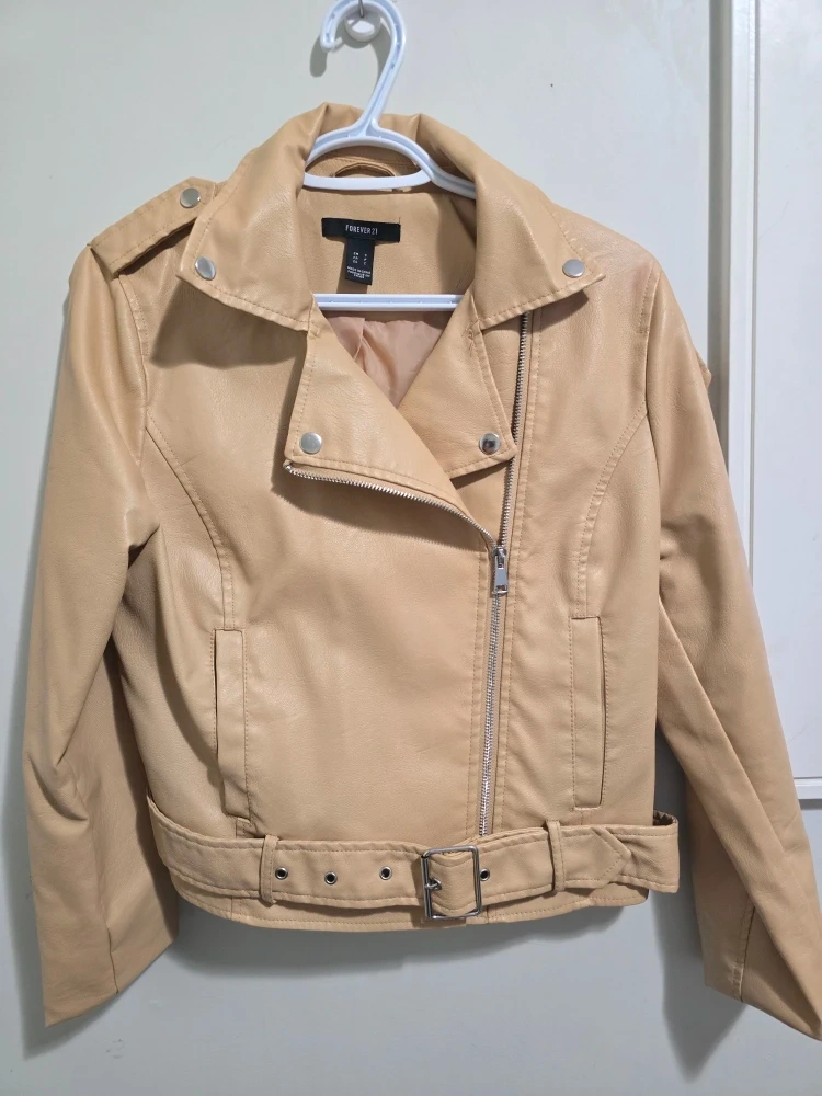 Selling a Forever 21 faux leather biker jacket in a lovely cream colour! It's a size small and features a classic biker design with an asymmetrical zip closure and belted waist. Perfect for adding a bit of edge to any outfit!