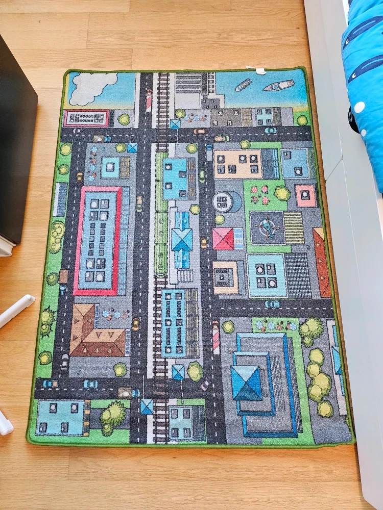 This city themed play rug is perfect for kids who love cars and trains! It's in good condition and ready for a new home. It features roads, buildings, and even a train track!