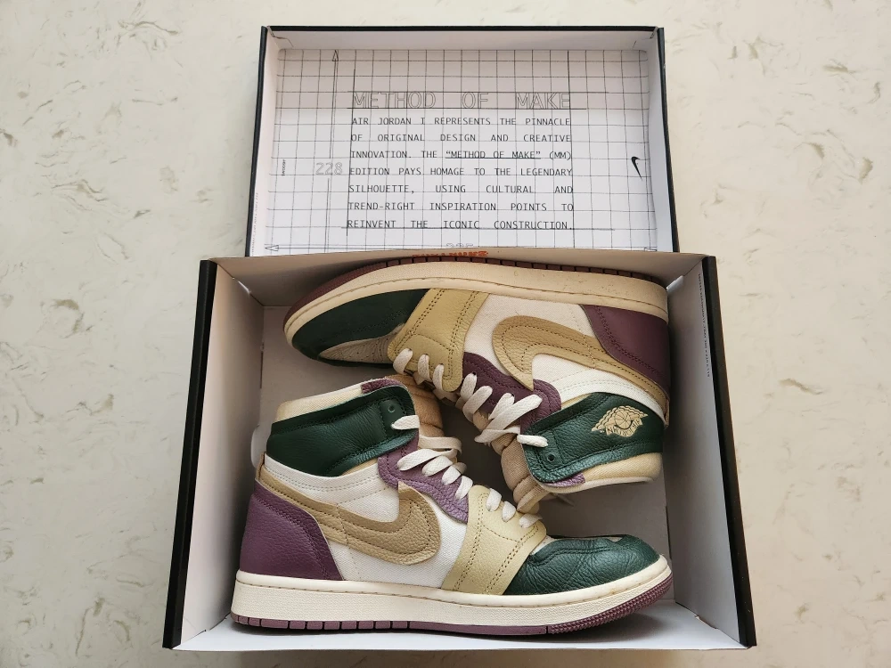 Women's Air Jordan High 1 MM Glactic Gade, Sail, Sky J Mauve, and Desert with a mix of premium leather overlays and soft, textured canvas or textile materials. They come with the original box!