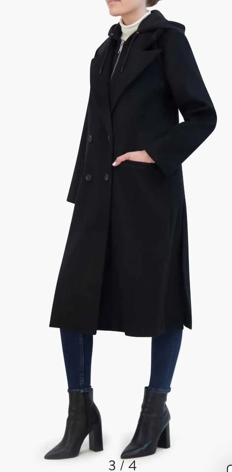 Luxurious double breasted wool coat has a bib front and hoodie that creates a downtown layered look without the added bulk. Casual and cool for verery occasion; on your way to the gym or a night out. Effortless style blended with timeless sophistication.