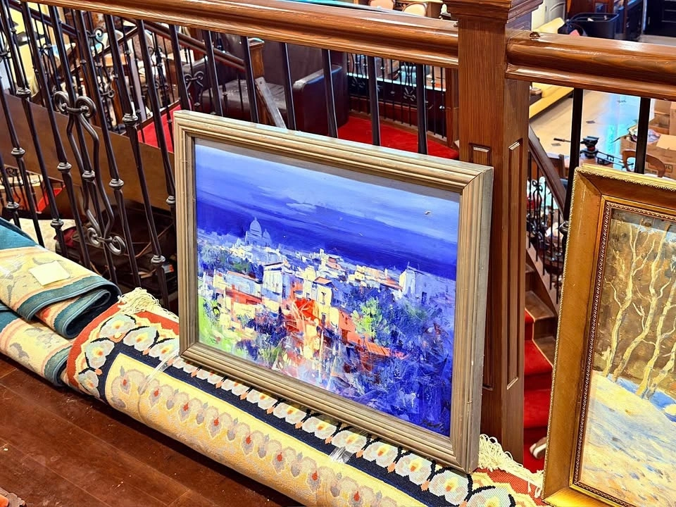 A vivid, expressive cityscape painted in rich blues, purples, and warm earth tones, capturing a sunlit hillside town overlooking the sea. The bold brushstrokes and energetic color palette give it an impressionistic, lively feel. Set in a classic wood frame, this piece adds a bright, dynamic focal point to any space.