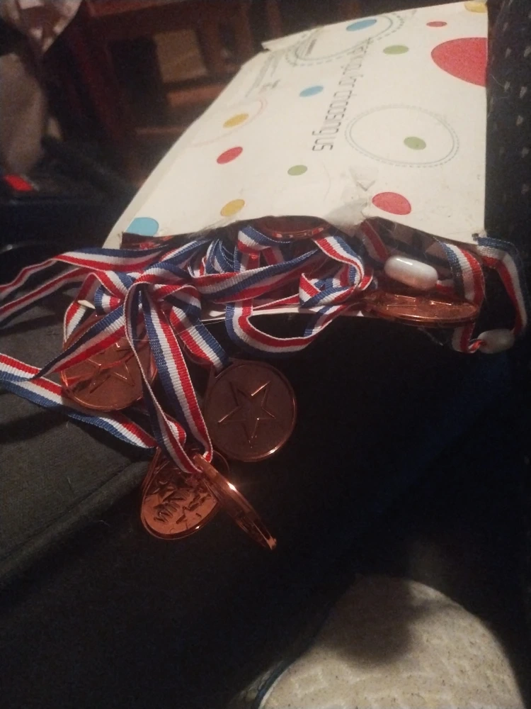 Selling a collection of platic bronze medals with red, white, and blue ribbons. They come in a polka dot bag. Great for handing out to kids at your child's birthday party