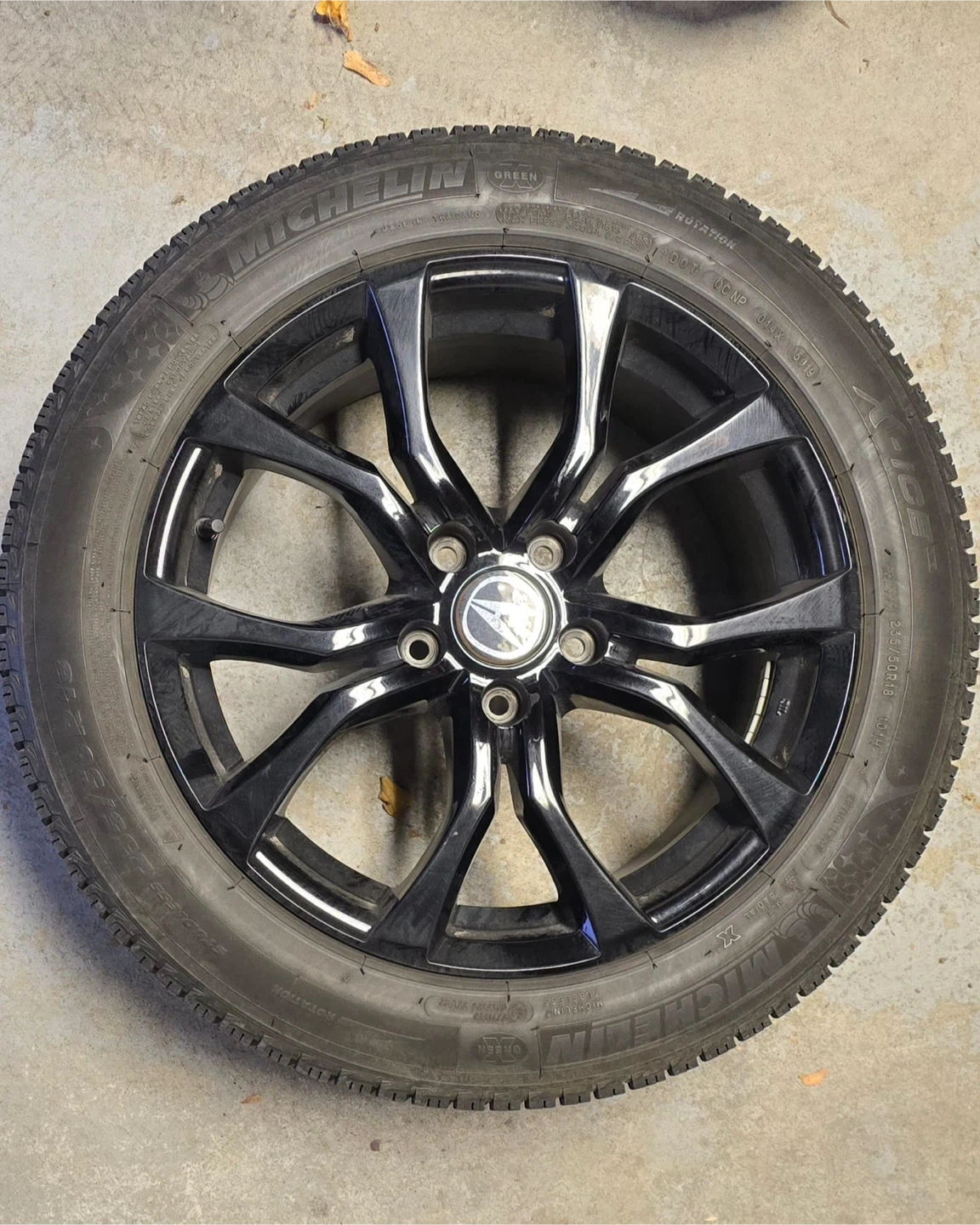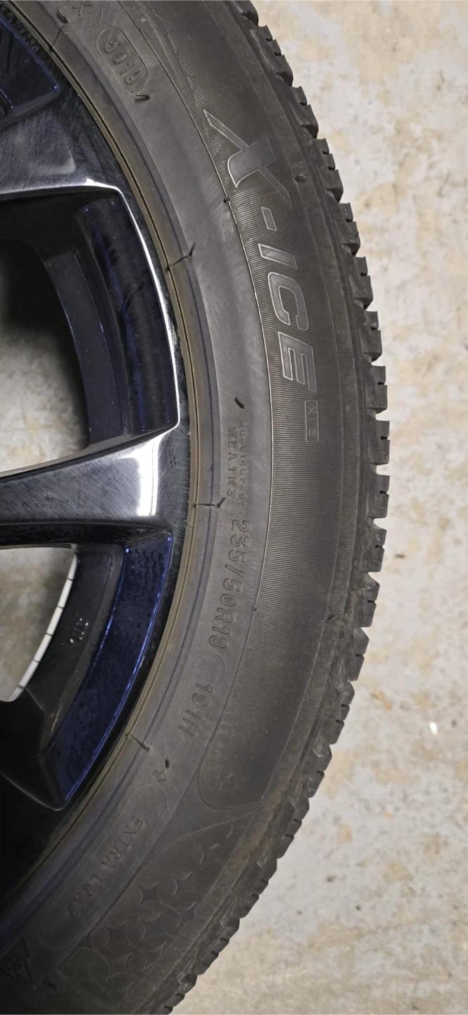 Michelin X-Ice Snow tire mounted on a stylish black rim. The tire size is 235/50R18. It's in great shape and ready to keep you safe on the road this winter! Includes sensors