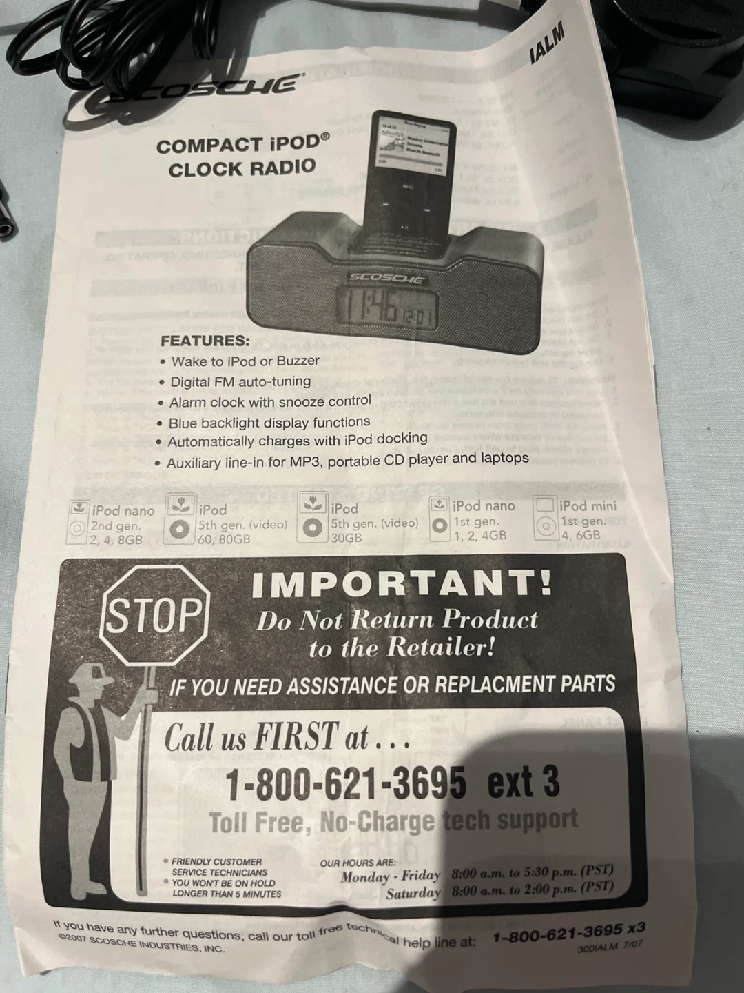 Selling a Scosche Compact iPod Clock Radio! It's a neat little device that can wake you up to your iPod or a buzzer. It also has digital FM auto-tuning and an alarm clock with snooze control. The blue backlight display functions are a nice touch, and it automatically charges your iPod while docked. Plus, it has an auxiliary line-in for MP3, portable CD players, and laptops