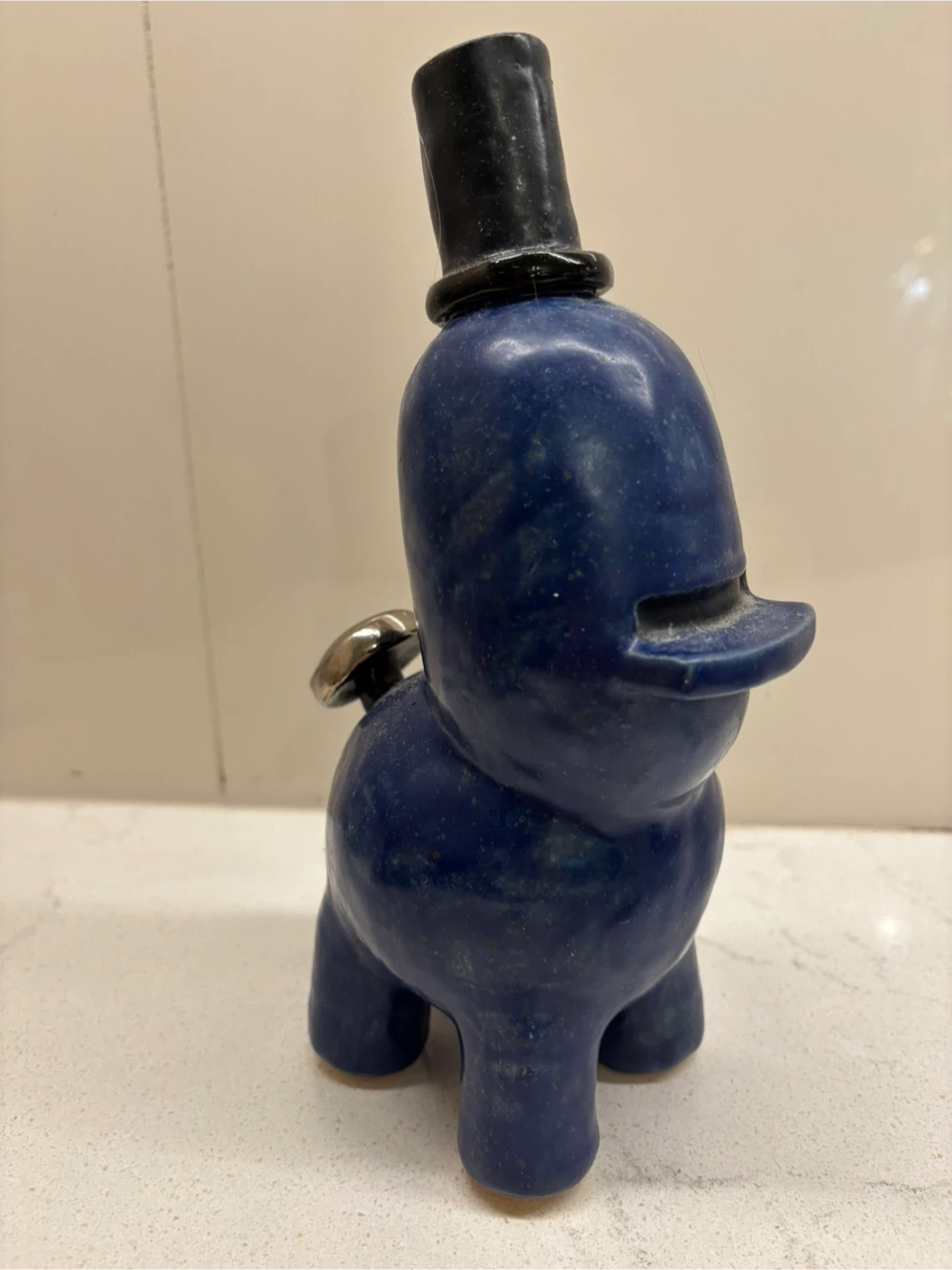 This is a unique blue ceramic figurine of an animal wearing a hat. It would make a great addition to any collection or as a decorative piece in your home. The figurine has a charming, handcrafted look. It's in good condition and ready to find a new home! It is handmade