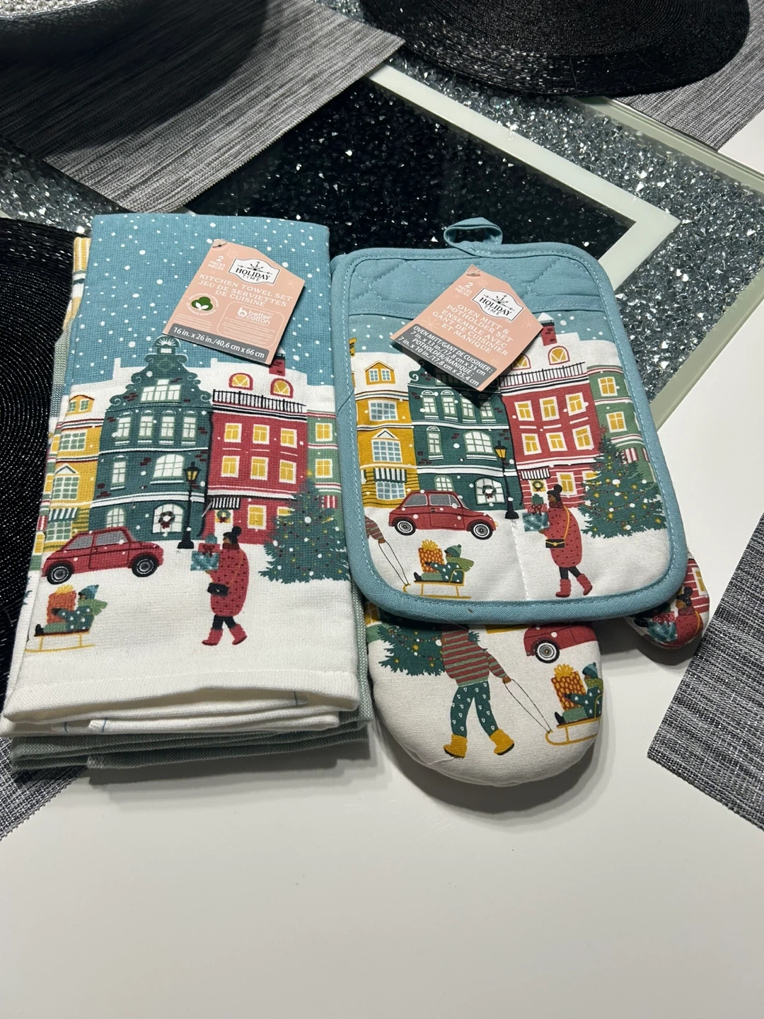 The set includes kitchen towels, an oven mitt, and a pot holder. The kitchen towels are 16 in. x 26 in. / 40.6 cm x 66 cm.