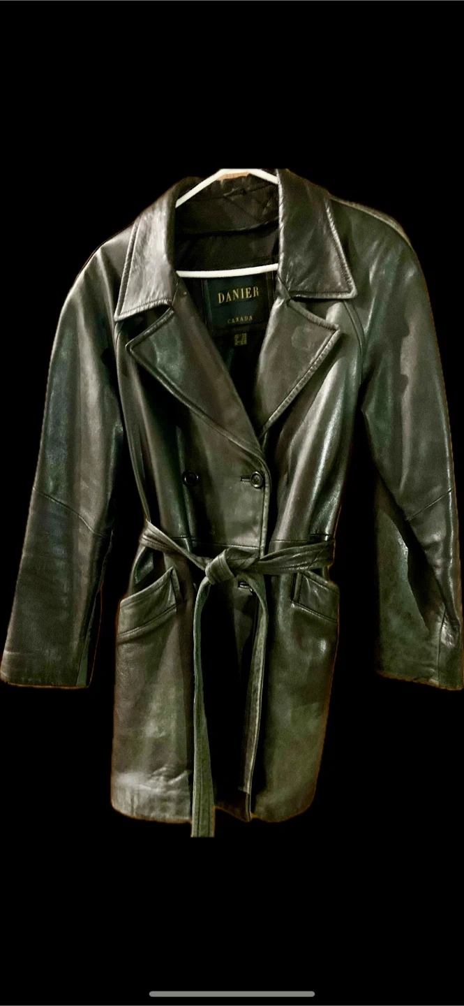Selling a Danier leather trench coat in size small! It's a classic style and in good condition. Perfect for adding a touch of sophistication to any outfit. The coat features a belt to cinch the waist and has a timeless design.