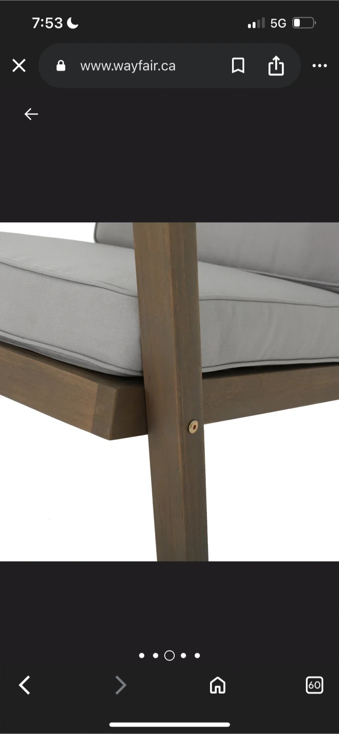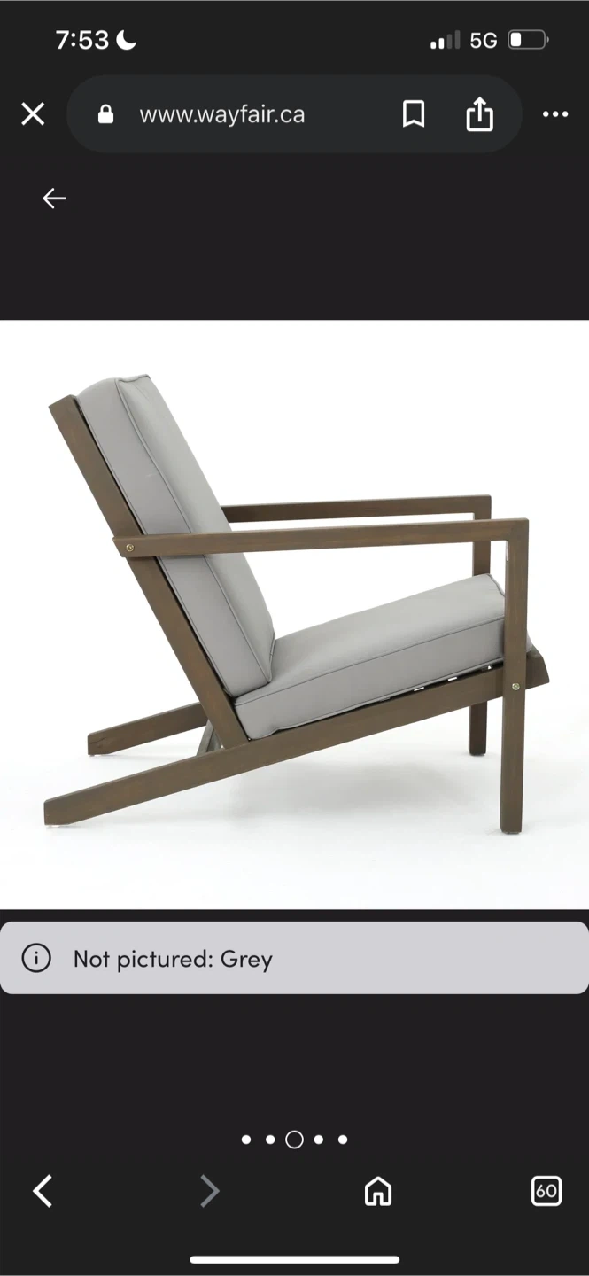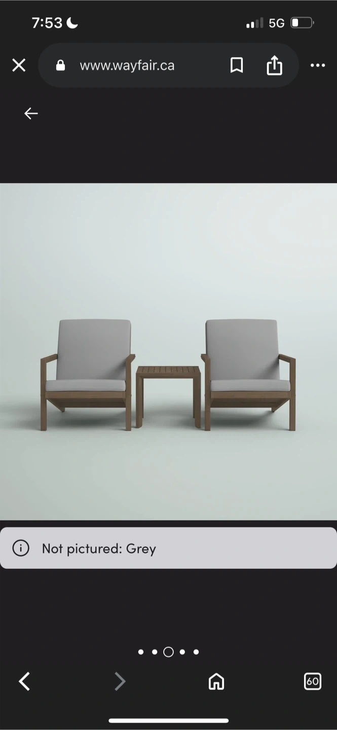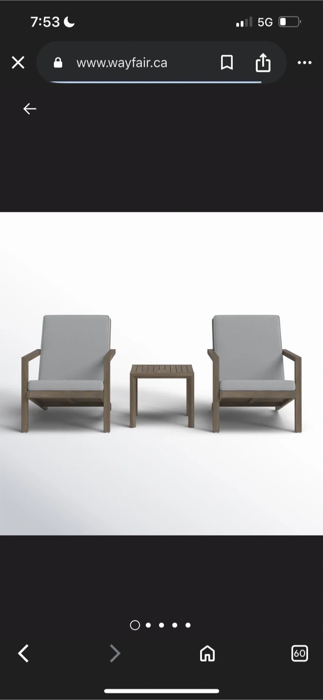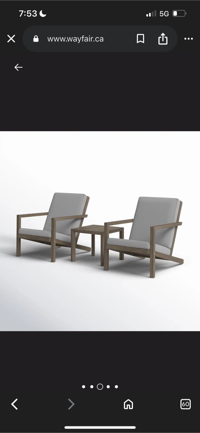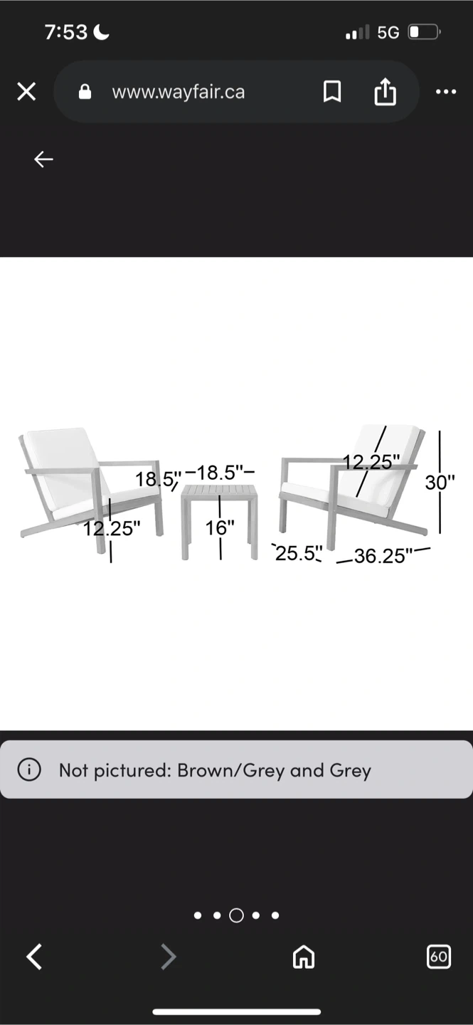 Selling a patio set from Wayfair! The set includes two chairs and a small table. The chairs measure approximately 30" in height, 25.5" in depth, and 36.25" in width. The table is about 18.5" x 18.5" and 16" tall. The set is brown/grey and grey.