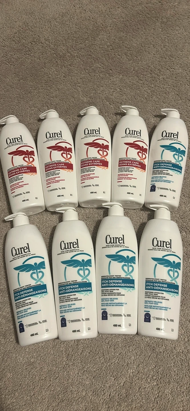 I have several bottles of Curel lotion available. There are two types: Extreme Care and Itch Defense. Each bottle contains 480ml of lotion. Perfect for dry or itchy skin!