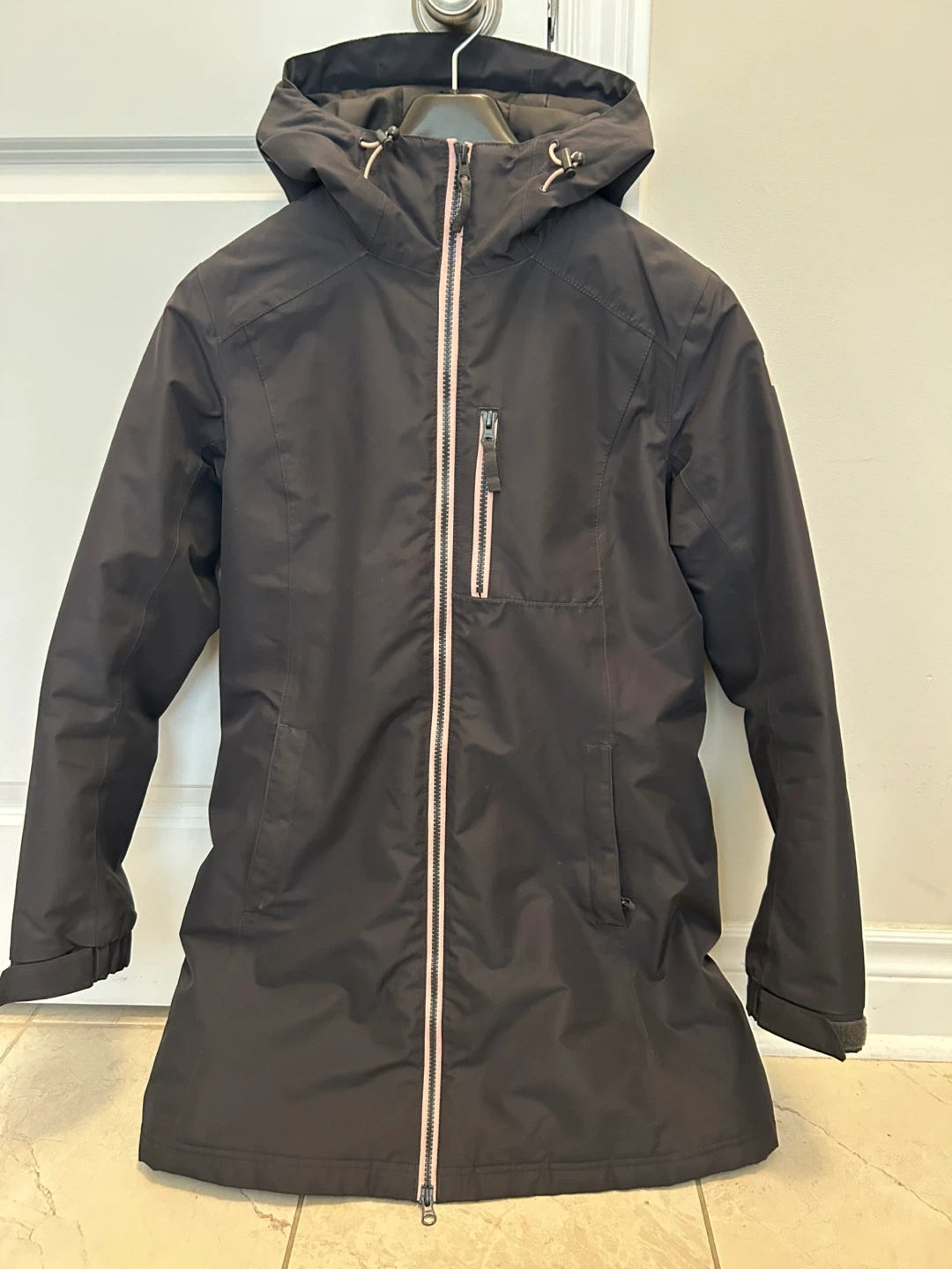 Selling a Helly Hansen women's coat! It's in great condition and ready to keep you warm and stylish. It is a rain jacket and keeps you super dry! The coat is a sleek, dark grey colour with a full hood and a pink zipper detail. Perfect for those chilly Canadian days!
