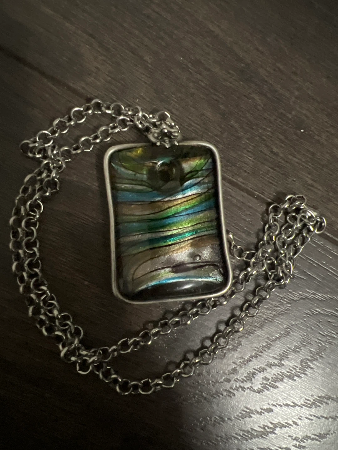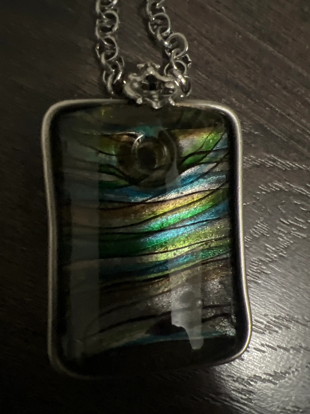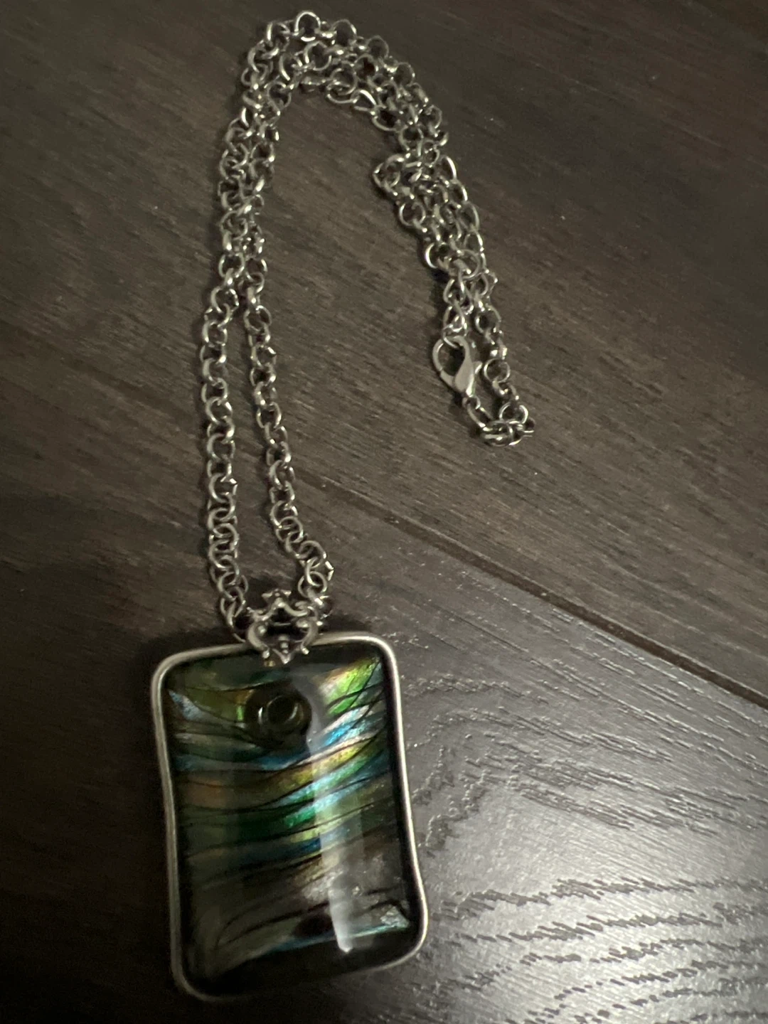 Selling a pendant necklace featuring a rectangular iridescent stone. The stone has a beautiful array of colours, including greens, blues, and golds. The chain is a classic silver colour. It's a unique piece that would add a pop of colour to any outfit!