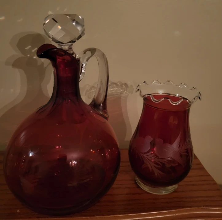 Vintage Ruby Red Glass Decanter with Stopper & Vase