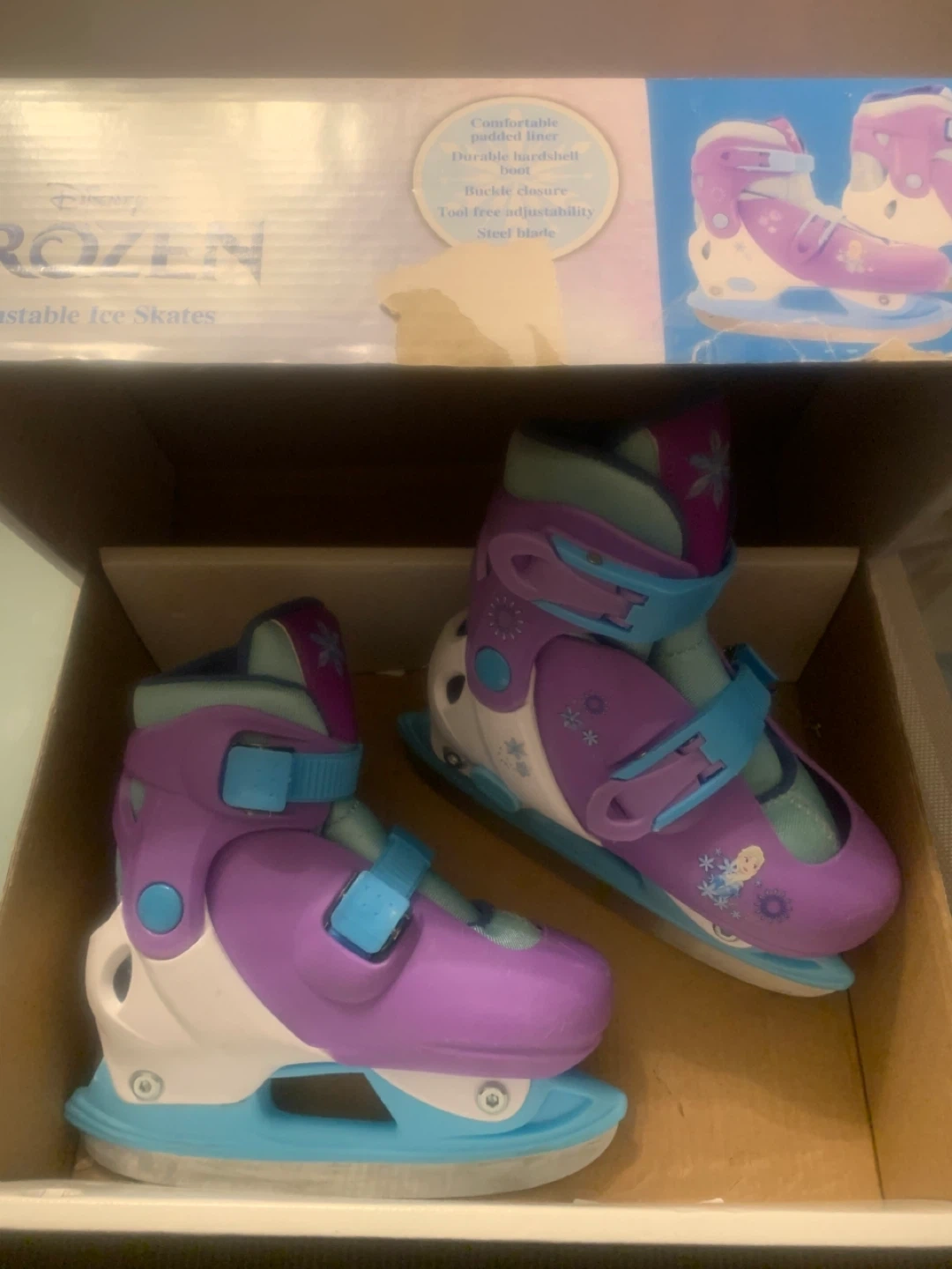 Selling a pair of Disney Frozen adjustable ice skates! They're in great shape and come in the original box. These skates adjust to fit sizes 8-11, perfect for growing kids. They feature a comfortable padded liner and a buckle closure for a secure fit. Your little one will love skating around with Elsa and Anna!