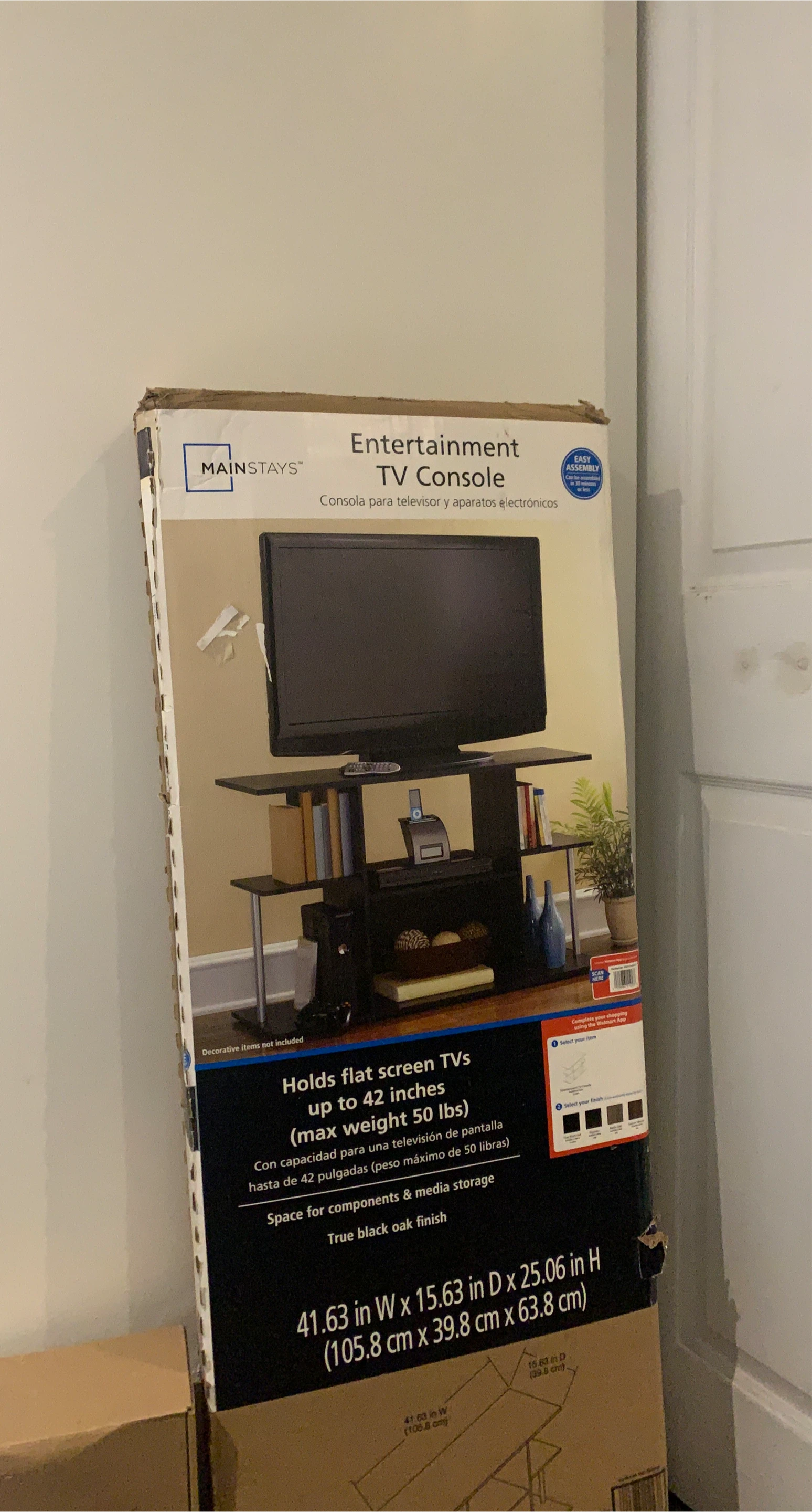Selling a Mainstays Entertainment TV Console in a true black oak finish. It holds flat screen TVs up to 42 inches (max weight 50 lbs). It also has space for components and media storage. Dimensions are 41.63 in W x 15.63 in D x 25.06 in H (105.8 cm x 39.8 cm x 63.8 cm).