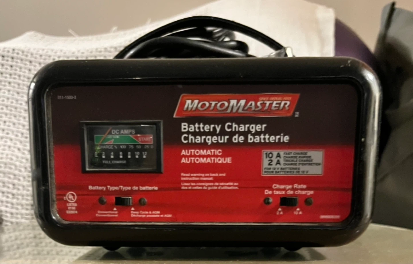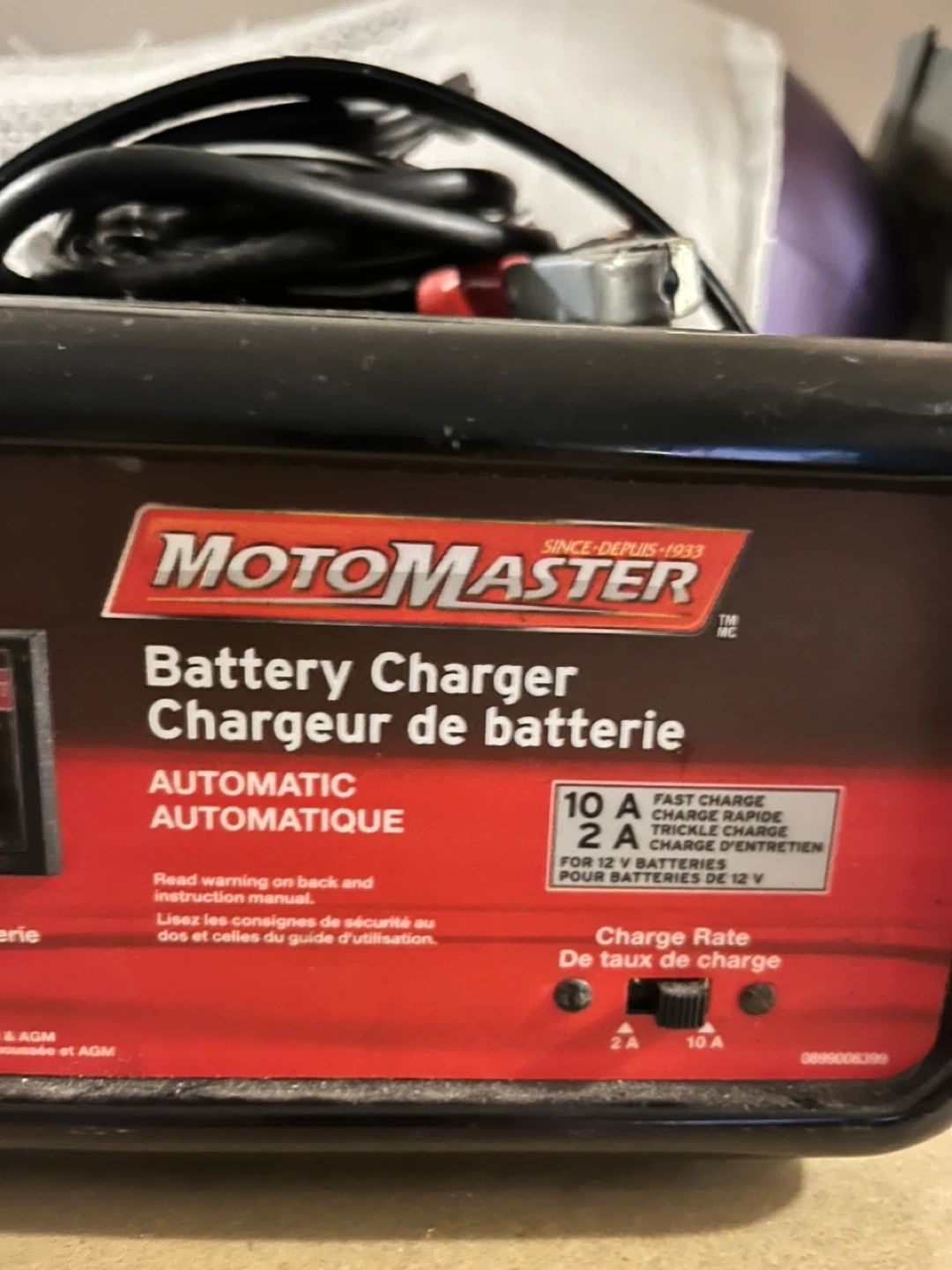 Selling a MotoMaster battery charger in good condition. It's an automatic charger with a 10A fast charge and 2A trickle charge setting for 12V batteries. Great for maintaining your battery!