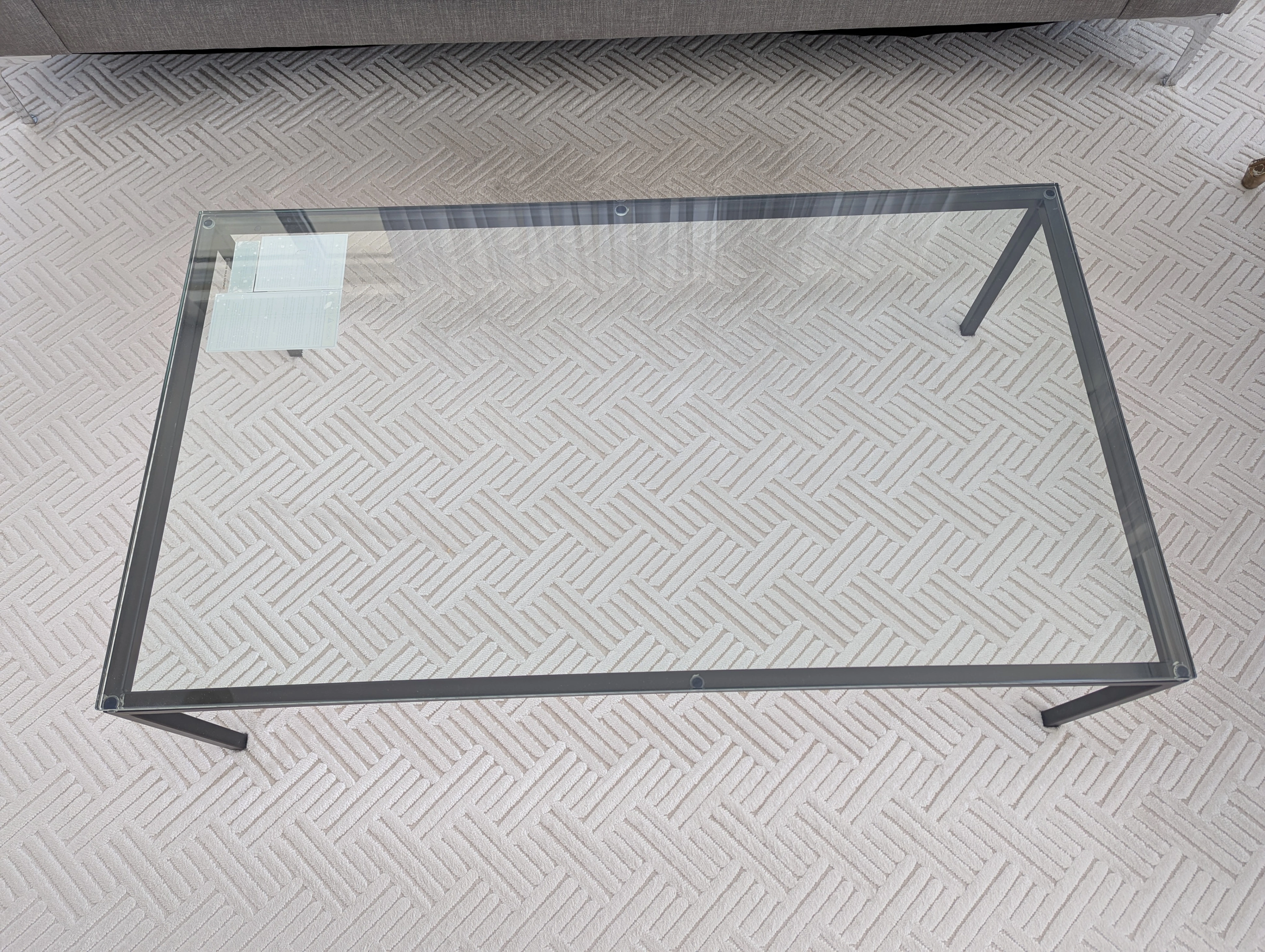 Coffee table made of glass with black frame, 42" x 24" x 13" (height). In like new condition, purchased from EQ3 a few years ago. Pickup near Metrotown skytrain station. Priced at $699 (before tax) from the EQ3 website: https://www.eq3.com/ca/en/product/cjwv4vdy500cs0158bj1zmm2j/living/accent-tables/coffee-tables/custom-coffee-table---24--x-42--glass-stainless-steel?cjuy8pjeu05pi01746bwsb68x=cjuy8pjf105pj0174arp5tfo0&cjuy8pjfu05pm0174zjoi1sfh=cjuy8pjgc05po0174s7s36tkg