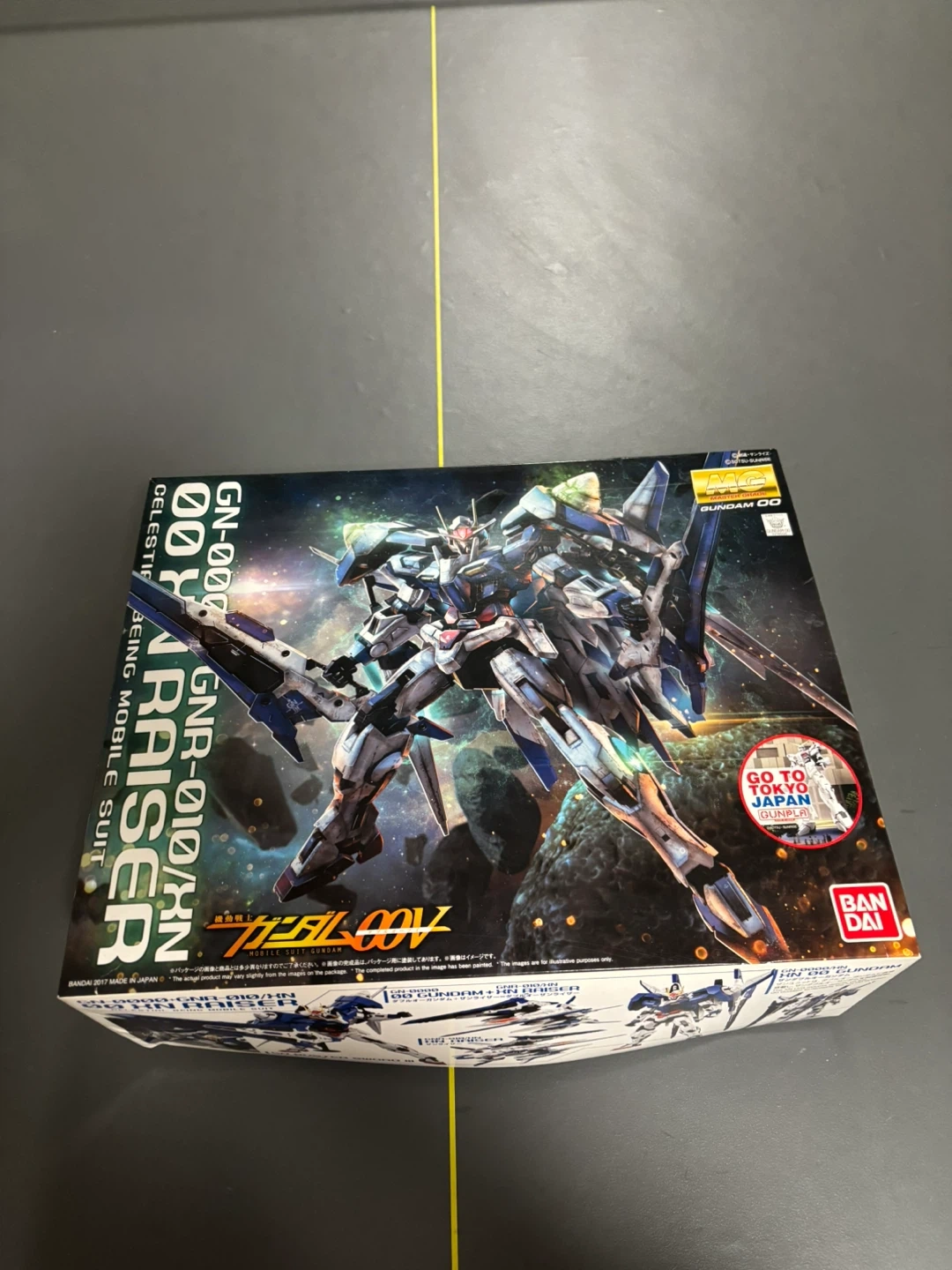 Get ready to assemble the Celestial Being mobile suit with this Bandai MG 1/100 GN-0000 + GNR-010/XN 00 XN Raiser Gundam! It’s in great shape. My son started assembling it — the head is already built, as shown in the photo — but all other parts remain intact and attached to the runners. All pieces are complete in the box, ready for you to finish this masterpiece.